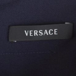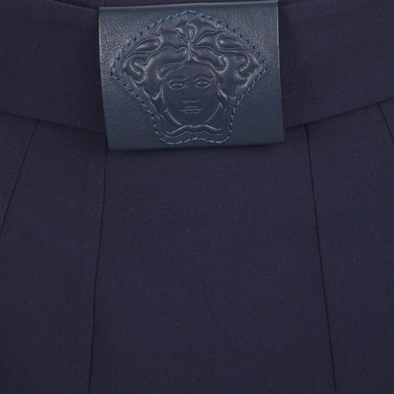 Fashioned in a rich navy blue wool, this pencil skirt from Versace comes with a Medusa leather patch that makes it both edgy and lust-worthy. It is well-appointed with neat pleats and secured with a concealed rear zipper closure. We think it looks absolutely flattering with a tucked in logo-tee or blouse.