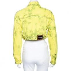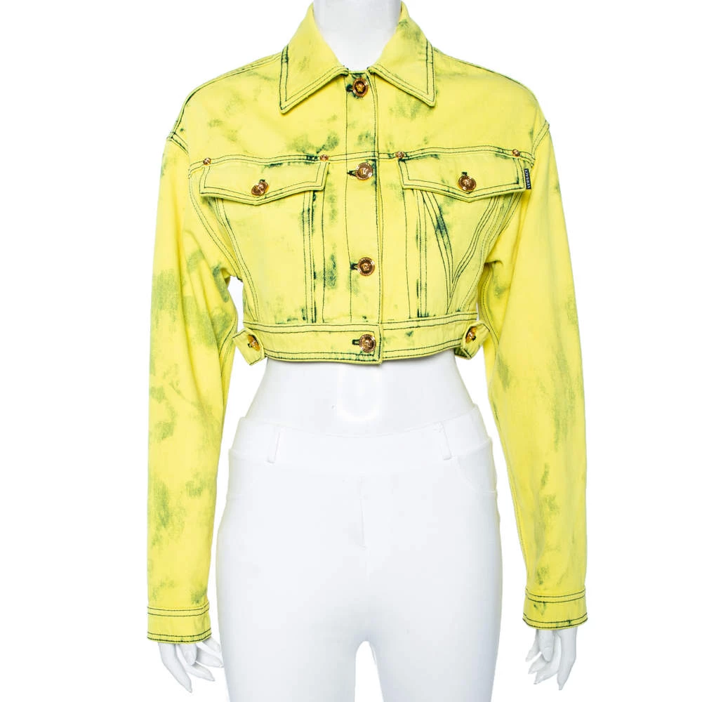 Add a pop of color to your ensemble with this stunning boxy jacket from the House of Versace. It is stitched using neon yellow denim fabric and features a cropped style. It comes with buttoned accents and two external pockets. Exude charm as you wear this Versace creation!