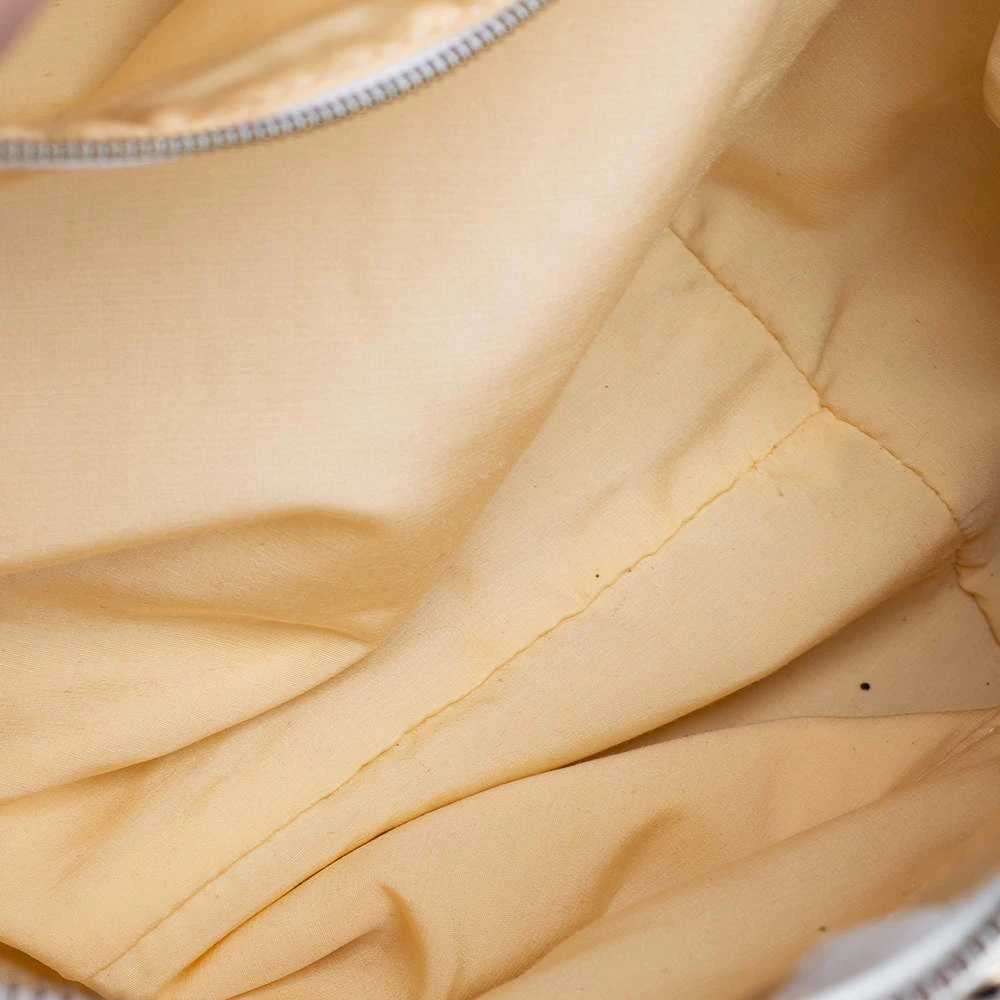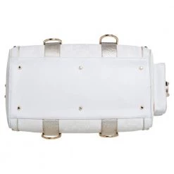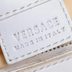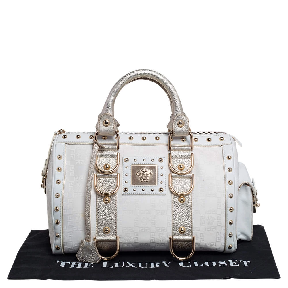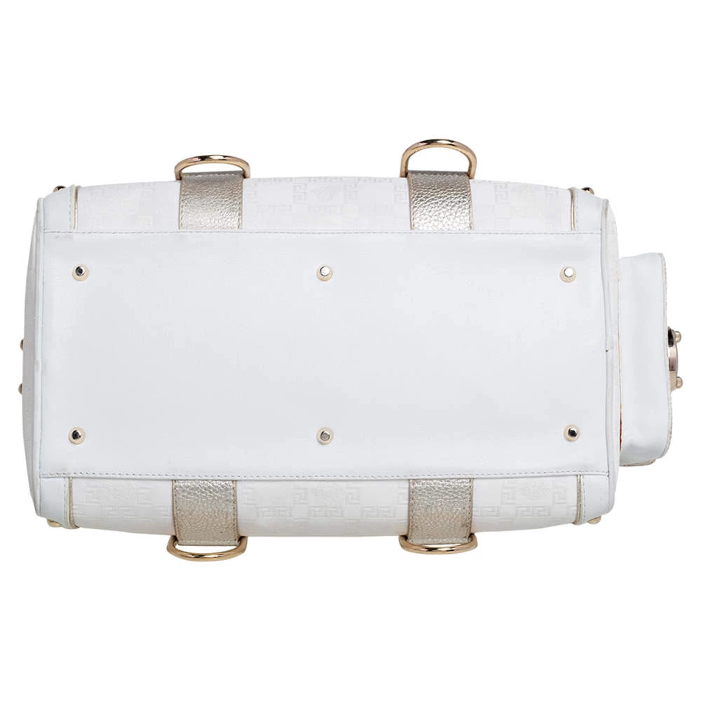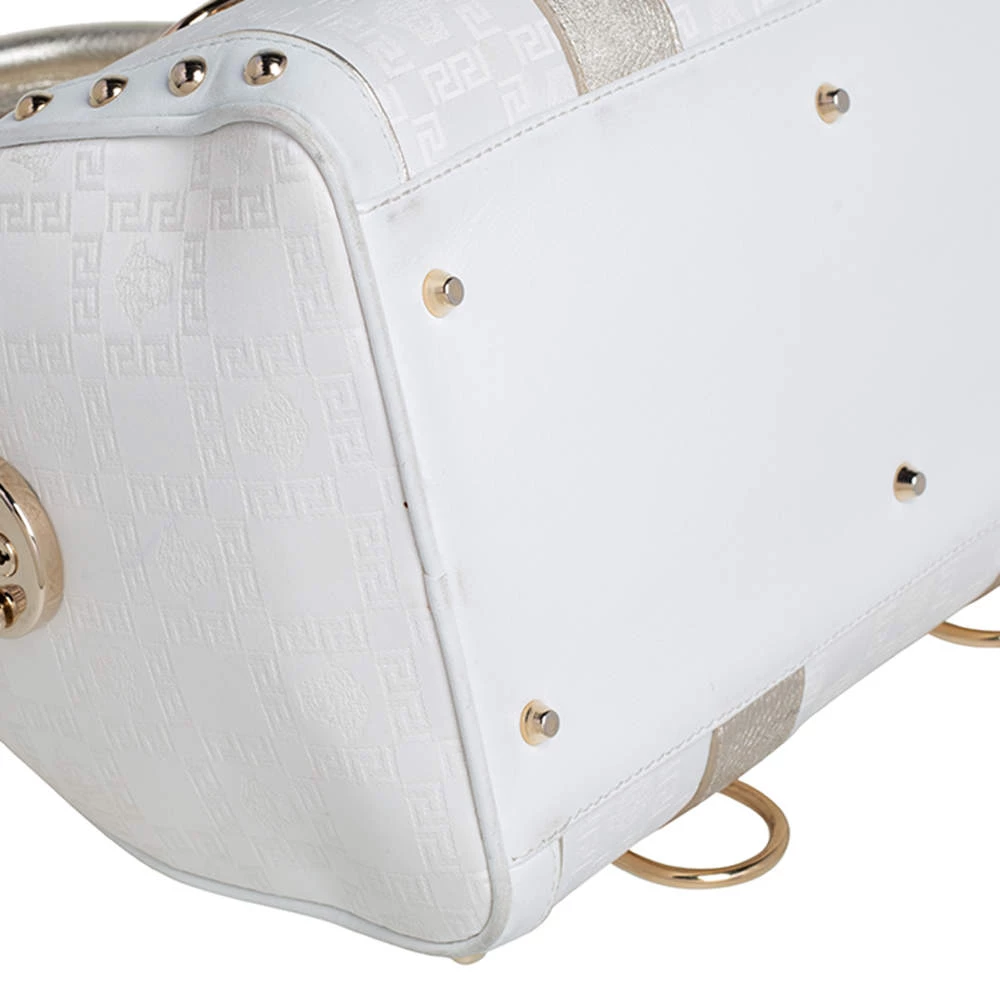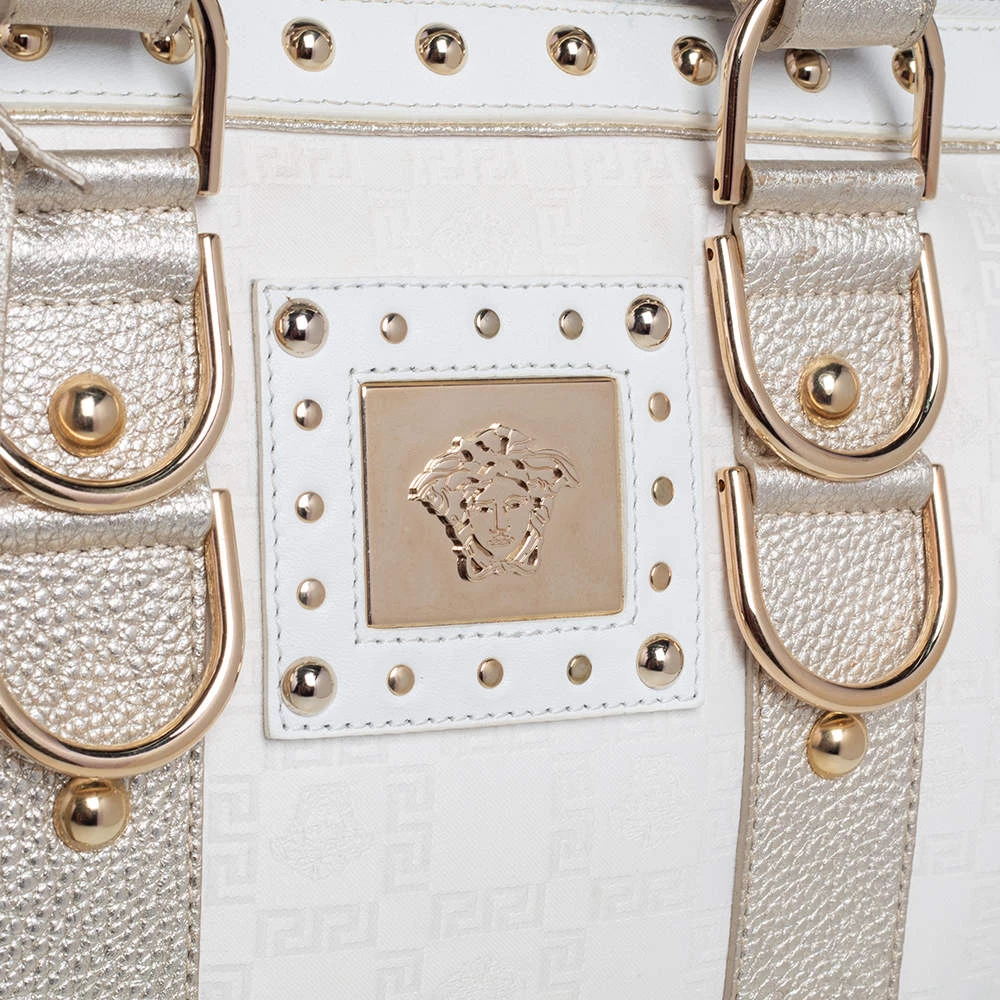 This Versace eye candy is crafted from off-white & gold monogram fabric & leather and detailed with gold-tone hardware with the logo plaque on the front. It has two short handles making it easier to carry it in the crook of your arm.
