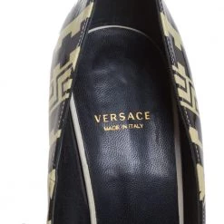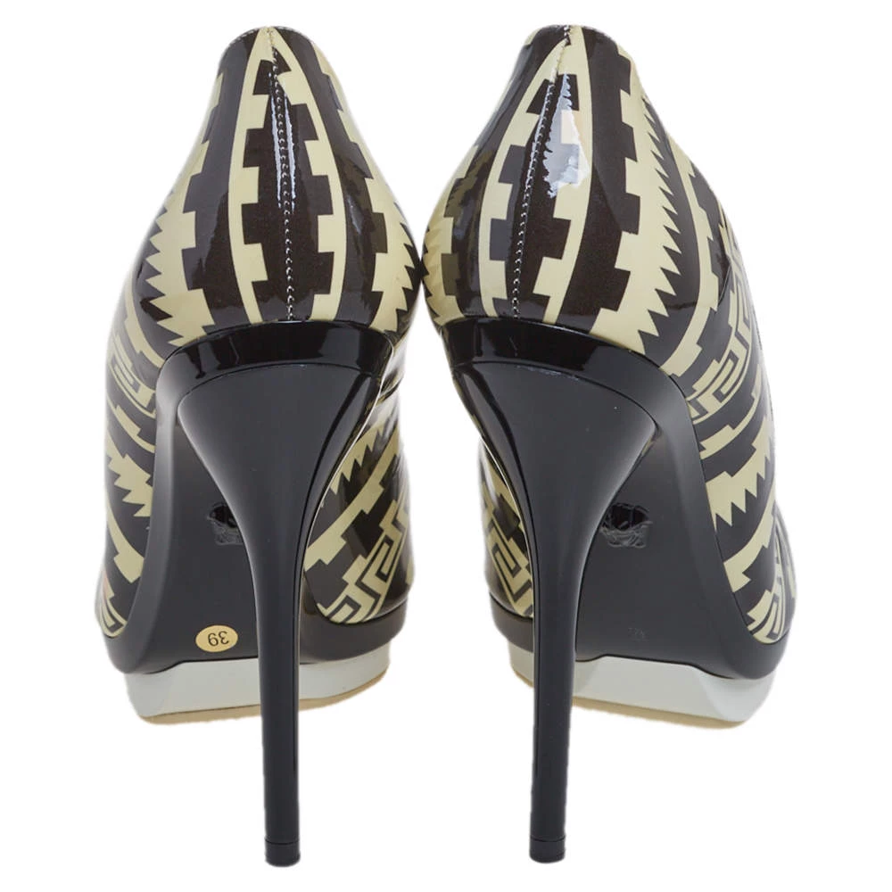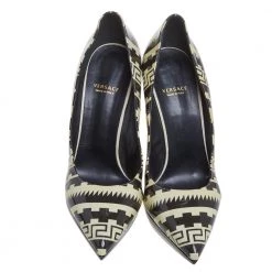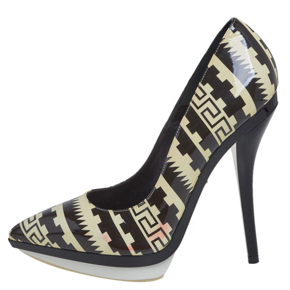 Get these classic pumps by Versace now. Crafted from black & off-white patent leather, they feature sophisticated pointed toes. 13 cm heels and platforms. Made in Italy, these heels have been designed to deliver style, comfort, and glamour. With pure rubber soles, they make a great buy.