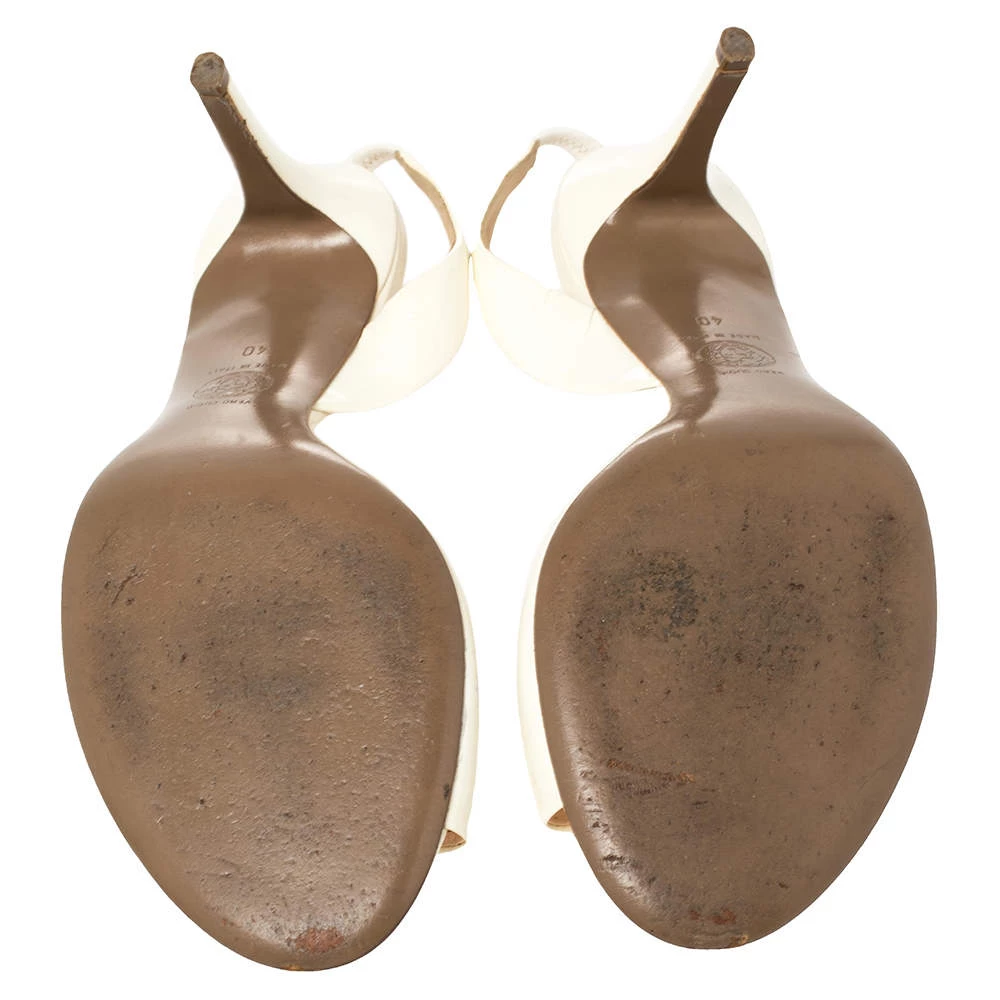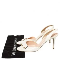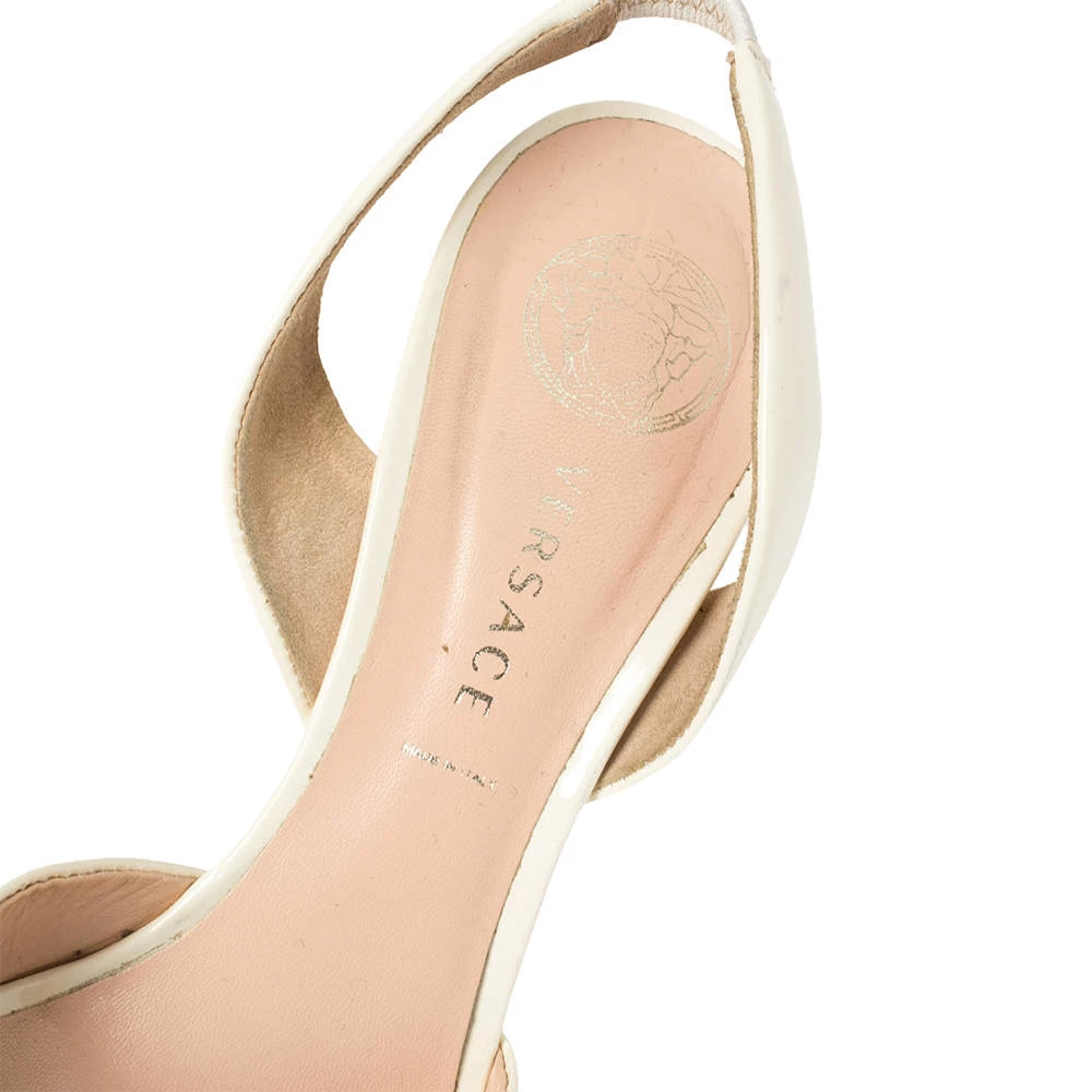 Get ready to dance all night long in these fabulous sandals from Versace! The off-white sandals are crafted from patent leather and feature an open toe silhouette. They have been exquisitely styled with slingbacks, comfortable leather-lined insoles, and elevated on 8 cm heels.