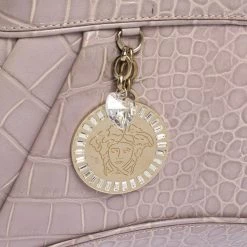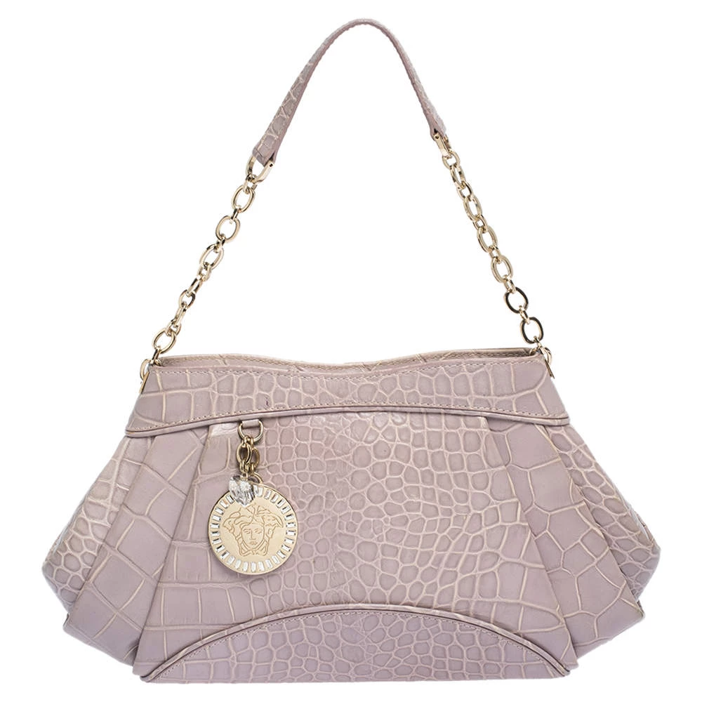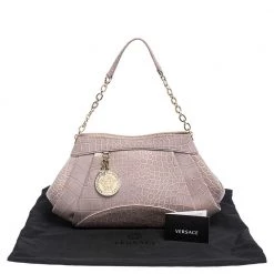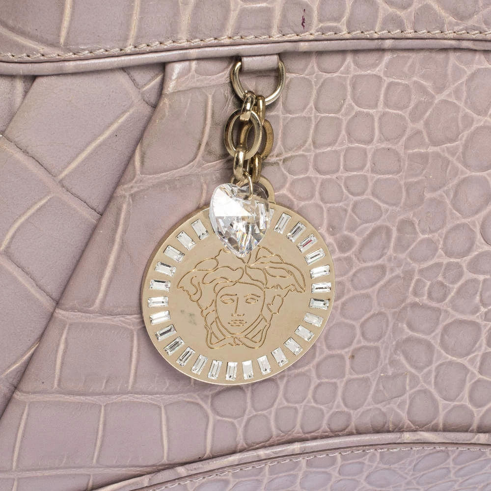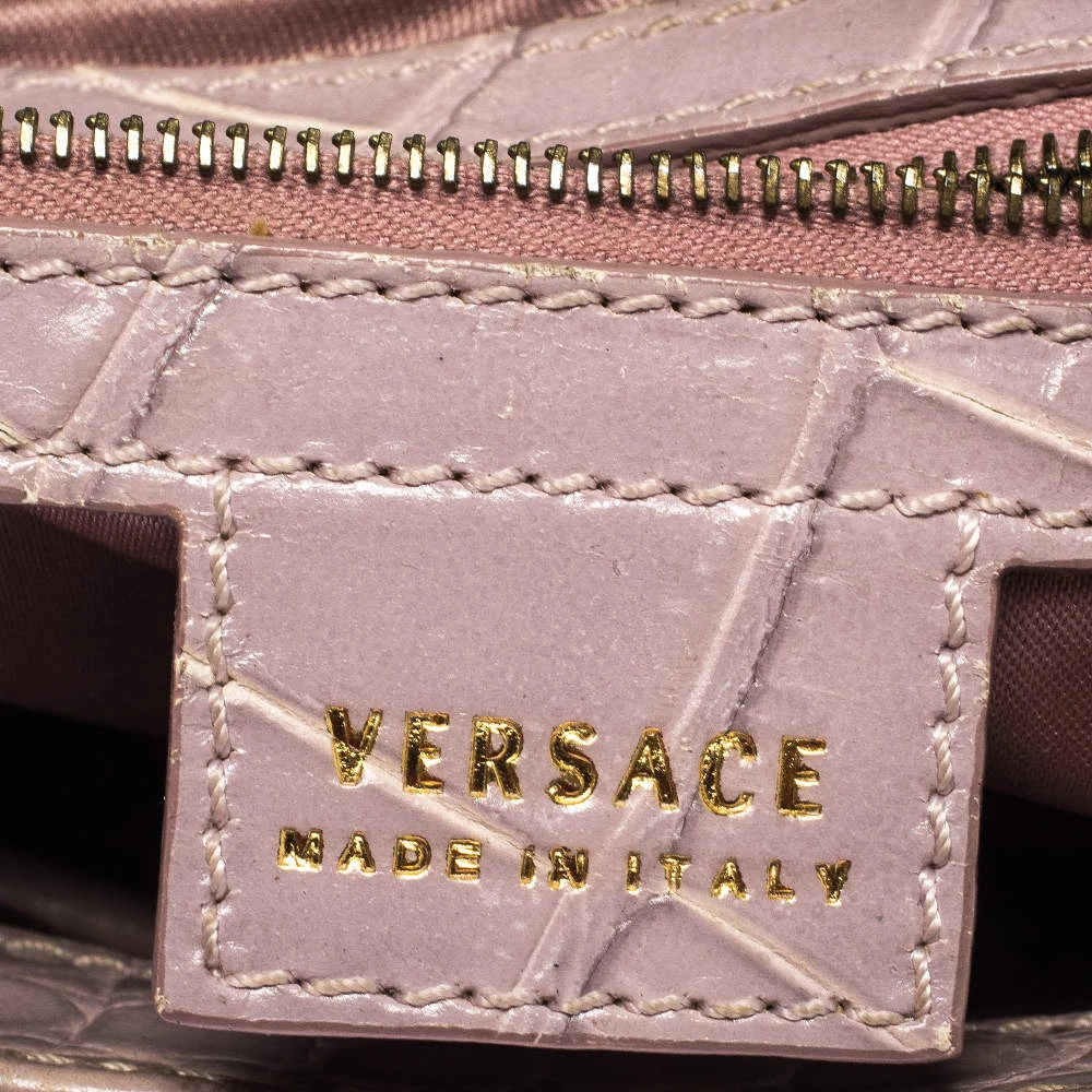 This stylish shoulder bag comes from the house of Versace. Crafted meticulously from croc-embossed leather, it comes in a lovely shade of old rose. It has interesting detailing on the sides, a brand charm and a single shoulder strap. It has a satin interior and is finished with gold-tone hardware.