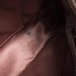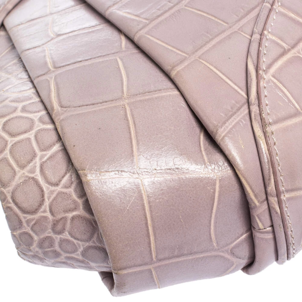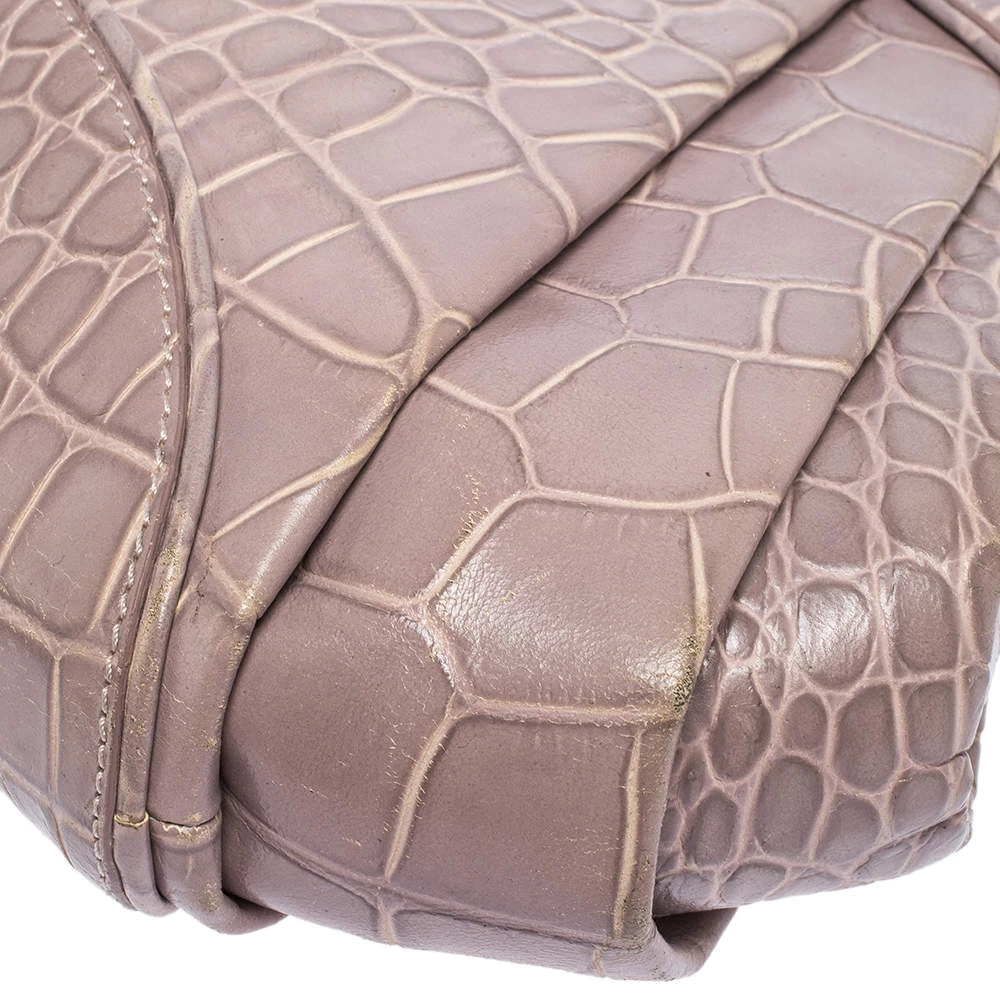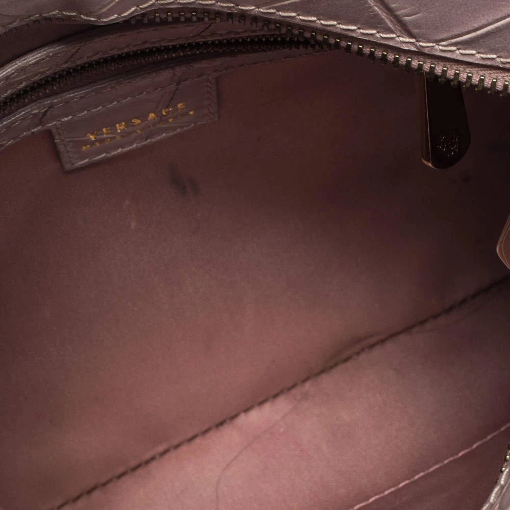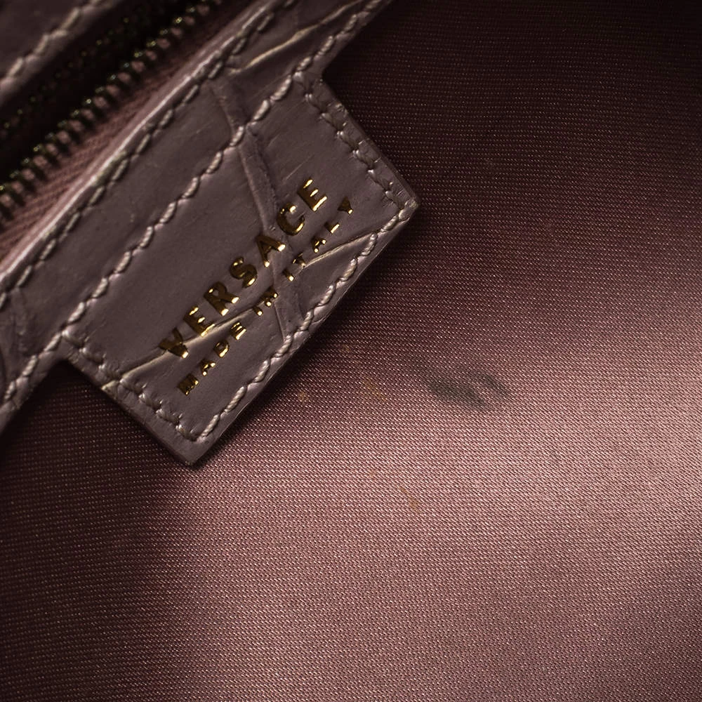 This stylish shoulder bag comes from the house of Versace. Crafted meticulously from croc-embossed leather, it comes in a lovely shade of old rose. It has interesting detailing on the sides, a brand charm and a single shoulder strap. It has a satin interior and is finished with gold-tone hardware.