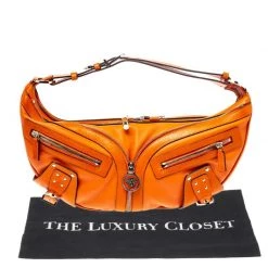 Made by Versace, this handbag is an immaculate balance of sophistication and rational utility. Designed with quality leather, this bag comes in a lovely shade of orange. This bag has a spacious interior lined with satin. The two pockets in the front with the logo in silver-tone add interest.