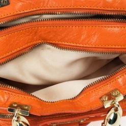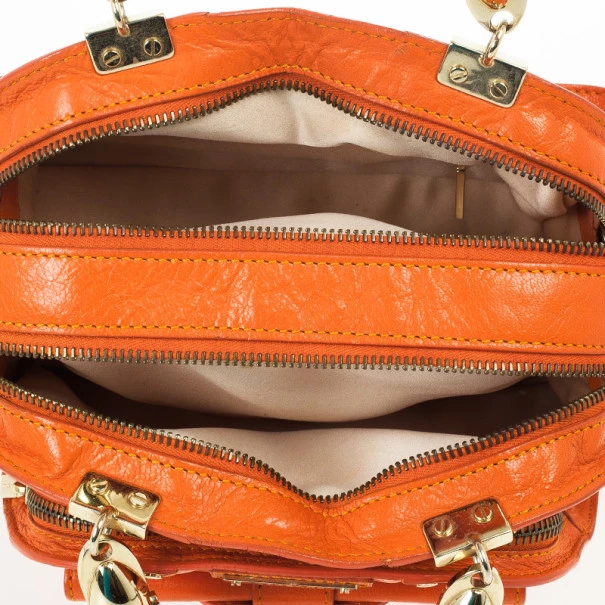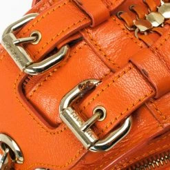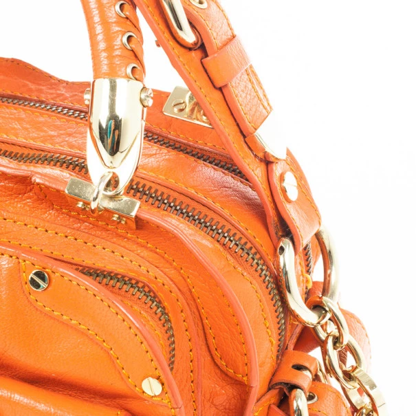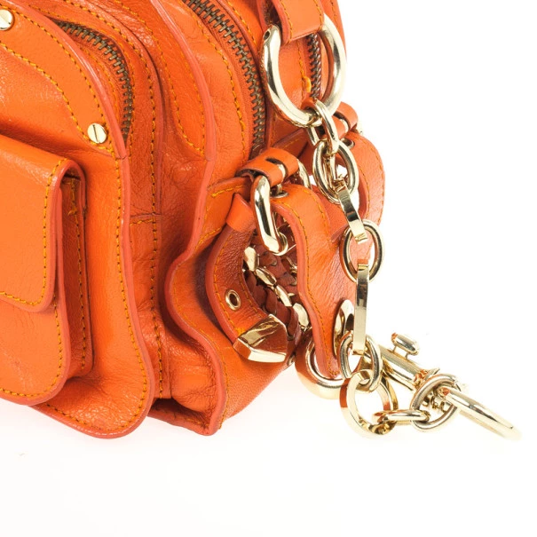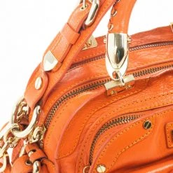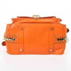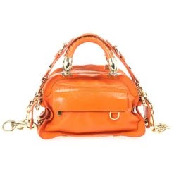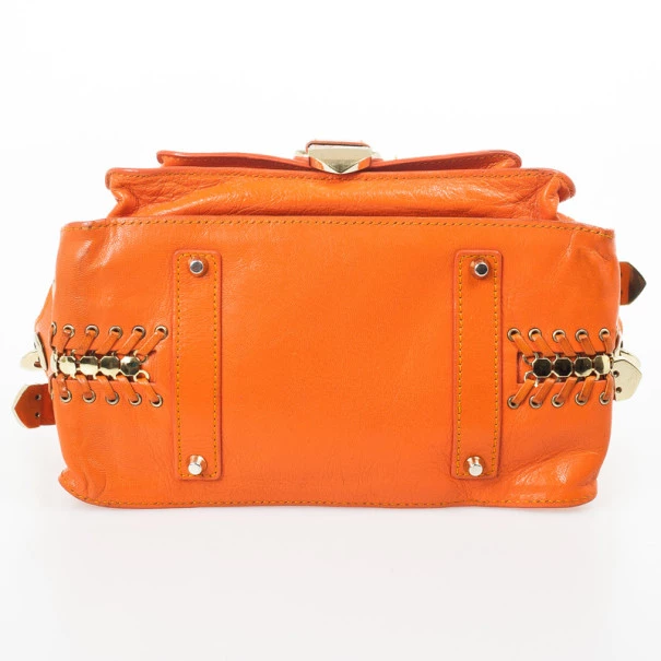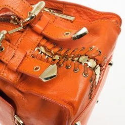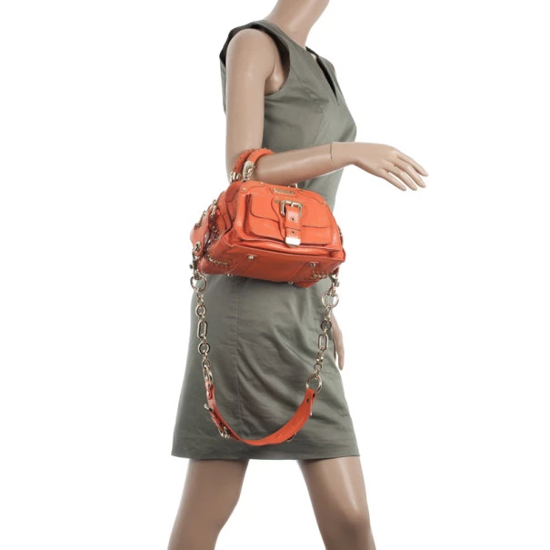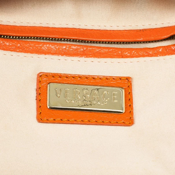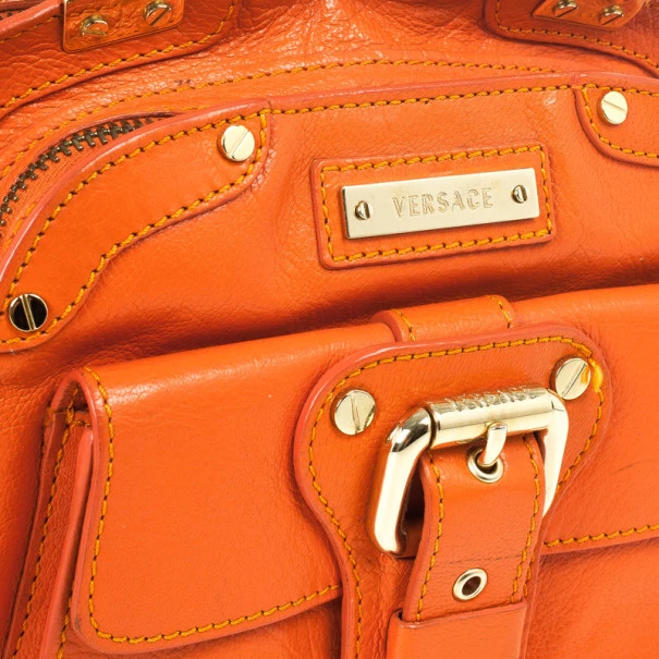 Bright up your outfits with this satchel by Versace. The exterior is made from leather and accented with gold tone hardware. This bag features one detachable chain-link and leather shoulder strap, front buckle fastened flap pocket, back flap pocket with a d ring and a zipper pocket. The corners and the two rolled leather handles are accented with leather and stud detailing. The double zippered satin lined interior compartments feature one Versace logo gold toned plate.