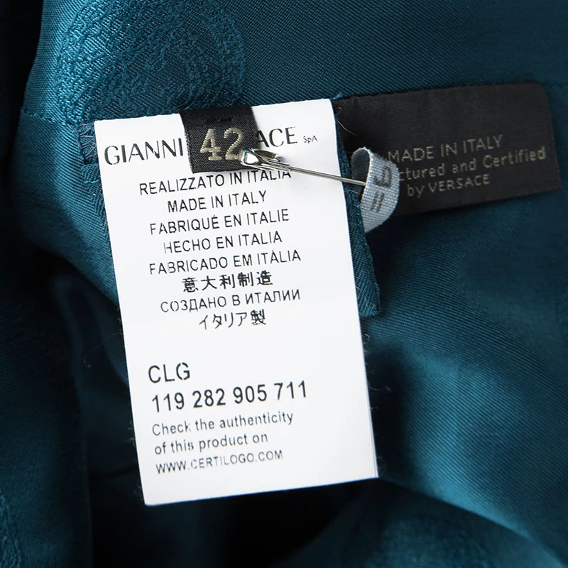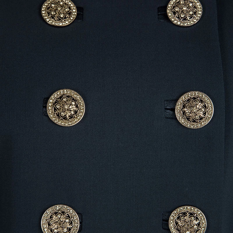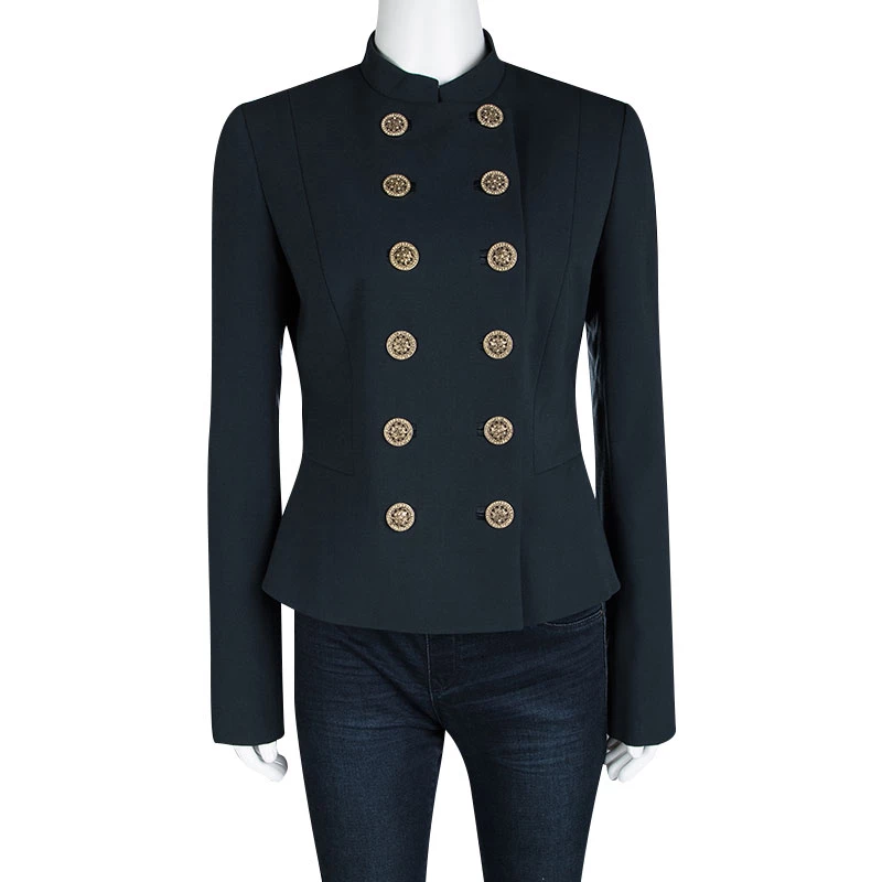 A jacket as finely tailored as this one from Versace deserves to be in your closet. It has been made from quality fabrics and it flaunts a peacock blue shade, double-breasted style, and a mandarin collar. It’ll look perfect with trousers and slingback sandals.