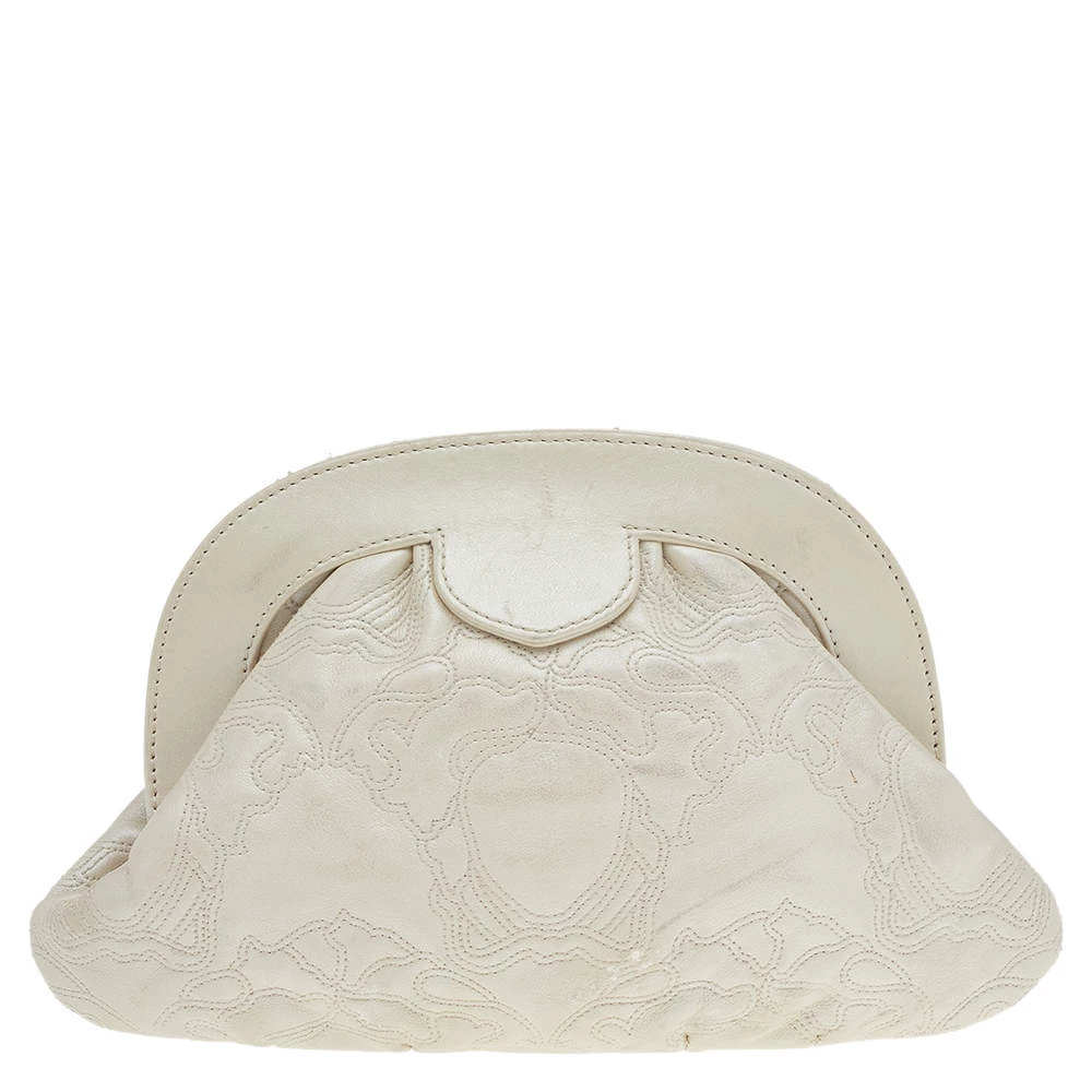 Versace’s clutch crafted using quilted leather has a compact size and a soft-hued exterior. It comes fitted with snap button closure, a satin interior, and is decorated with the Medusa logo. Stow all your evening essentials in this sleek clutch.