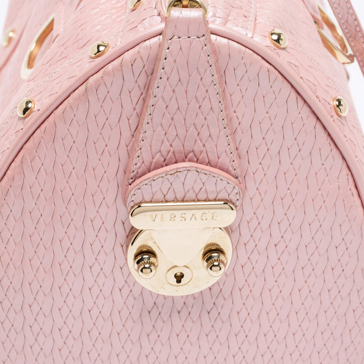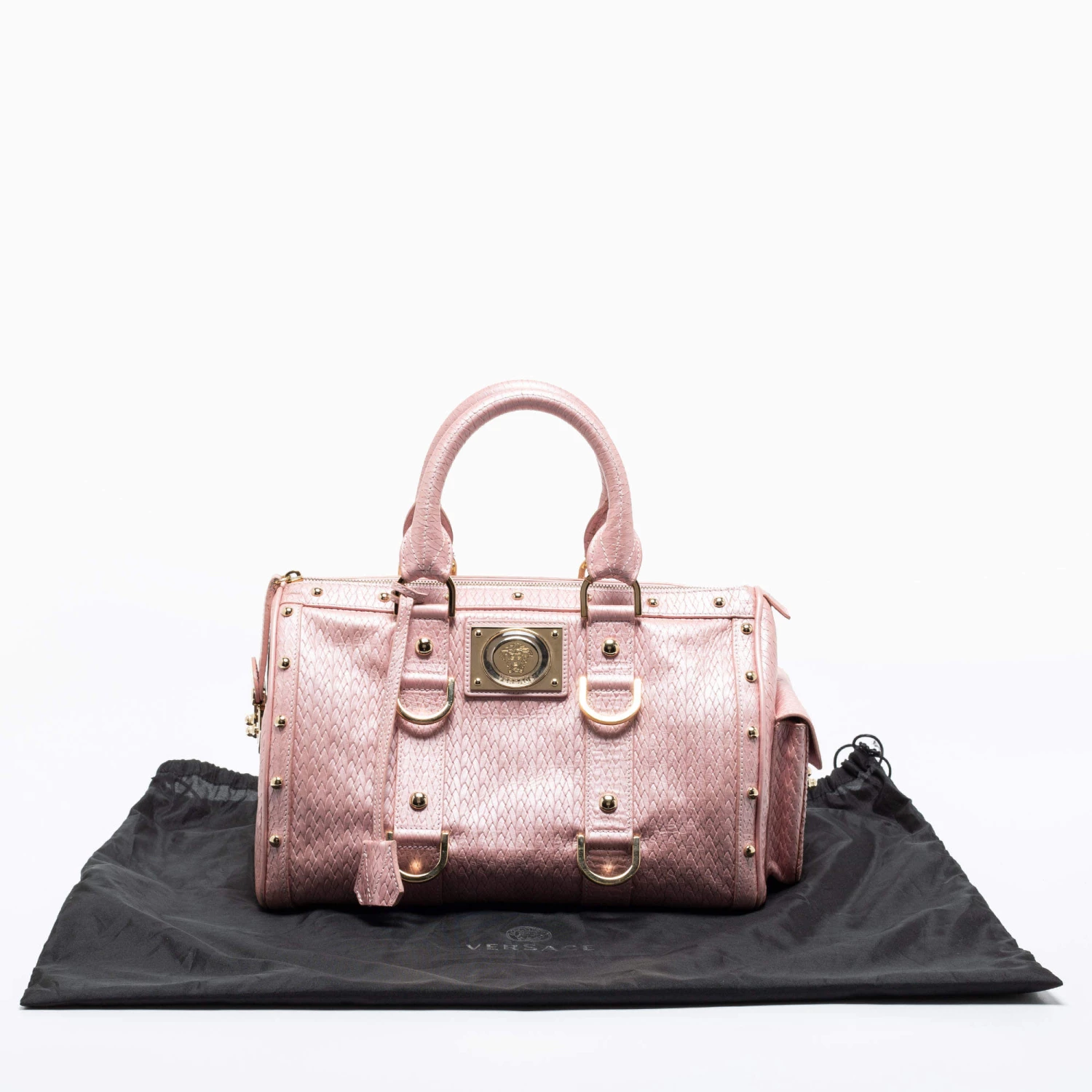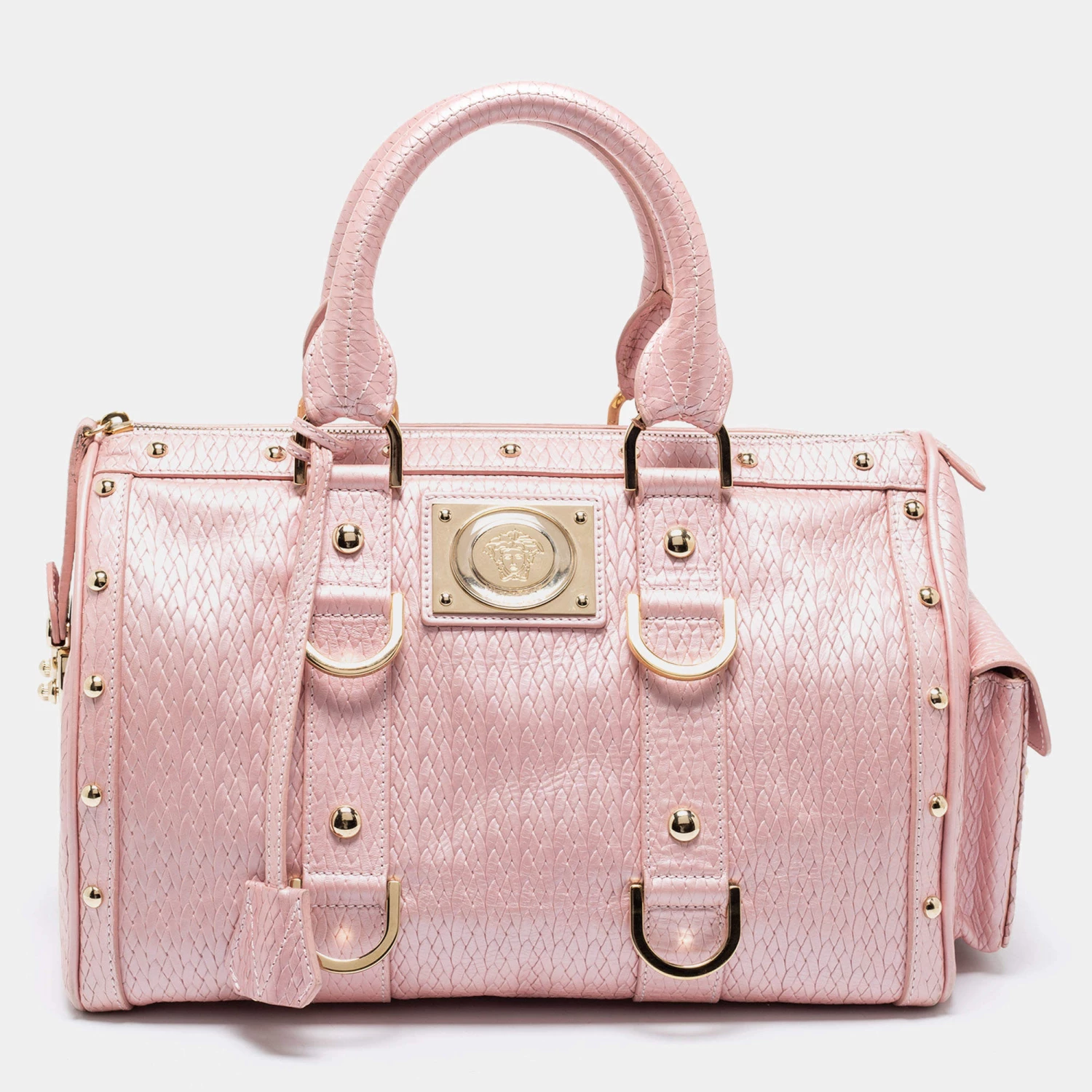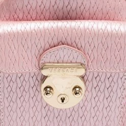 How gorgeous is this satchel from Versace! It carries an amazing design and a fabulous interplay of pink braided, embossed leather, and gold-tone hardware. It has a zip-top leading to a plush satin interior while being held by two top handles. The fabulous shape and the brand logo on the front uplift its beauty and make it a buy you will not regret.