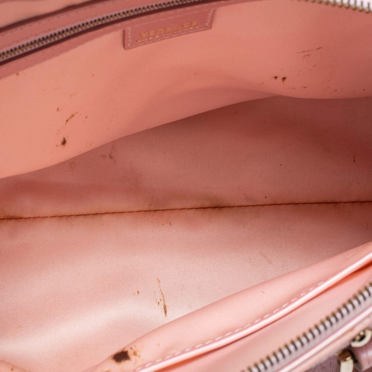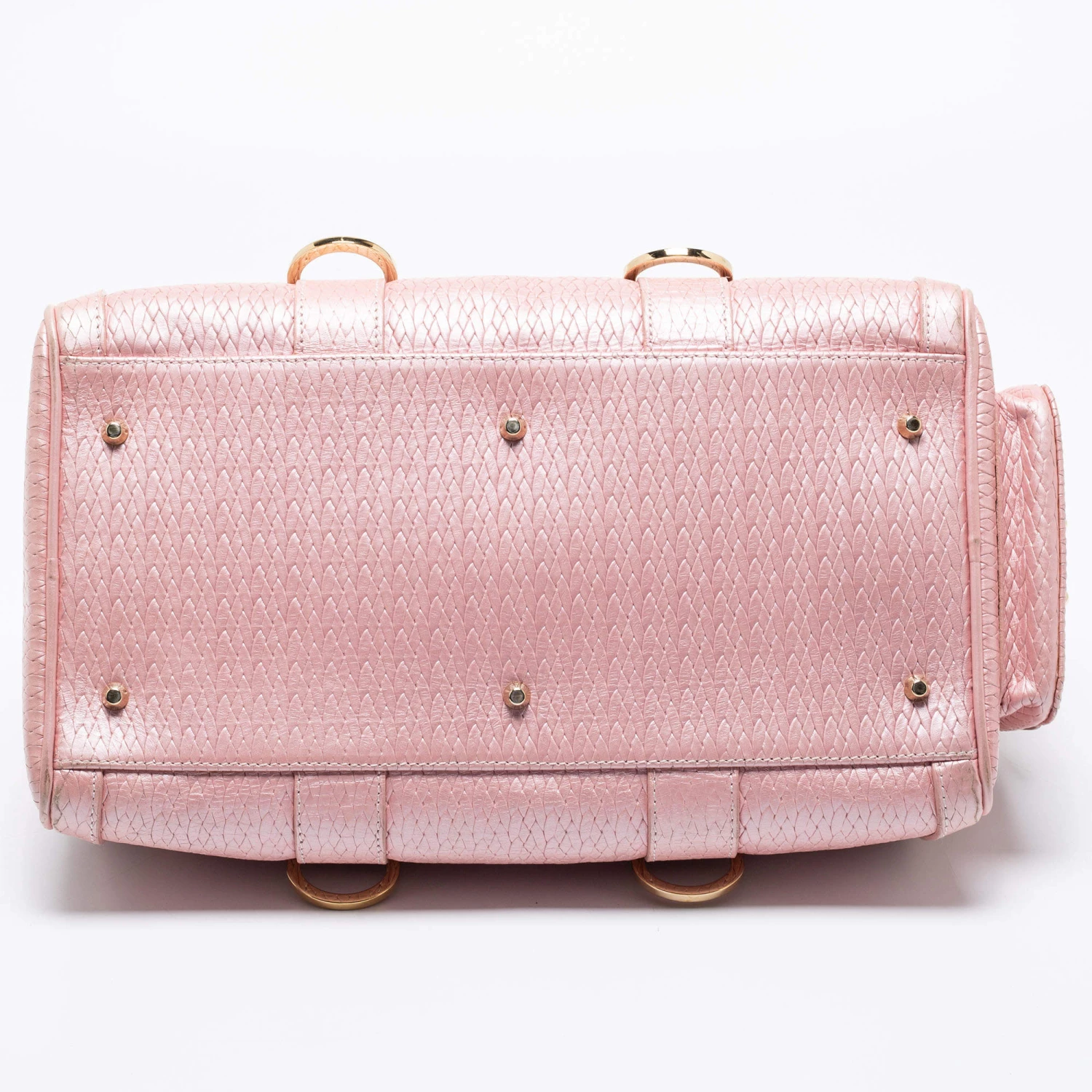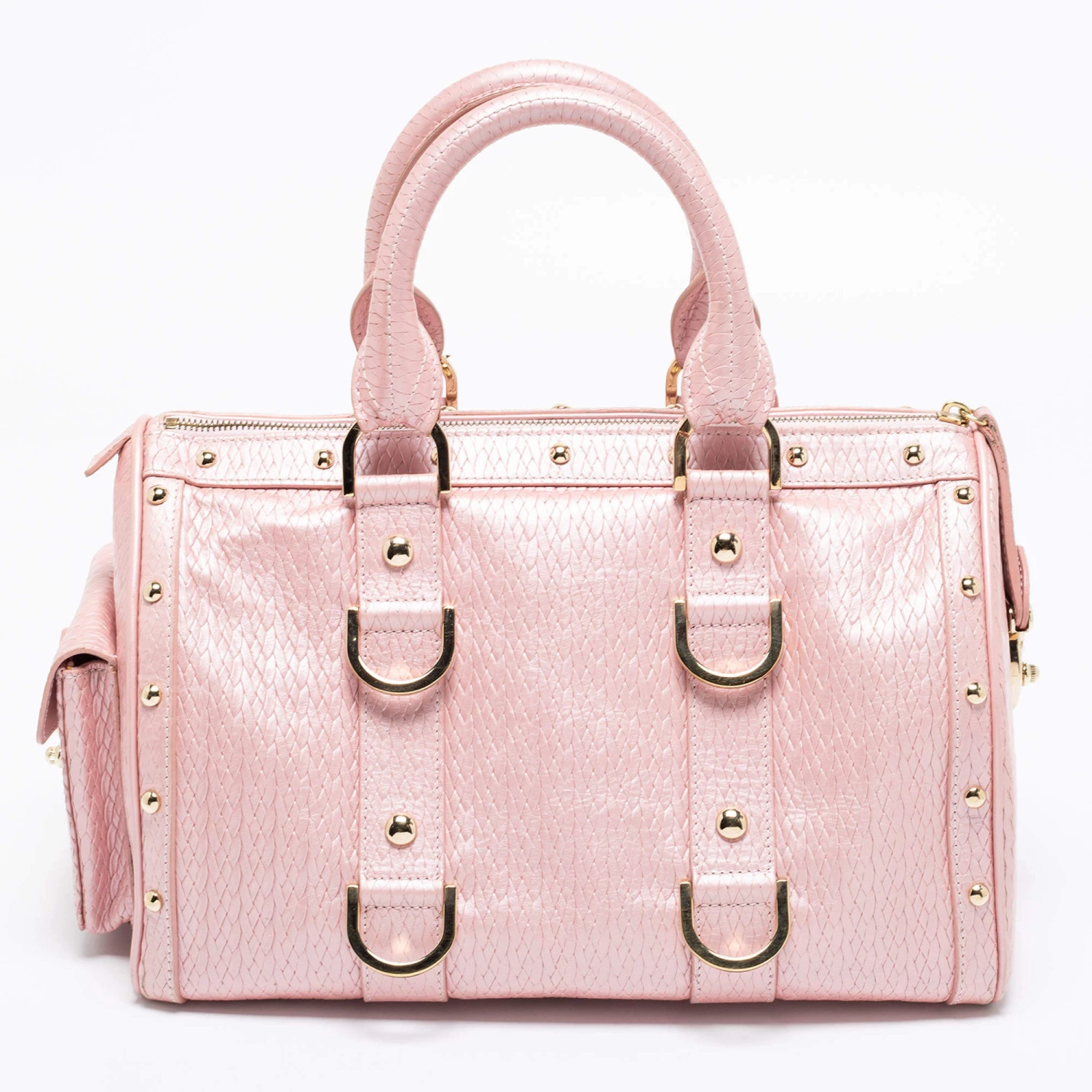 How gorgeous is this satchel from Versace! It carries an amazing design and a fabulous interplay of pink braided, embossed leather, and gold-tone hardware. It has a zip-top leading to a plush satin interior while being held by two top handles. The fabulous shape and the brand logo on the front uplift its beauty and make it a buy you will not regret.