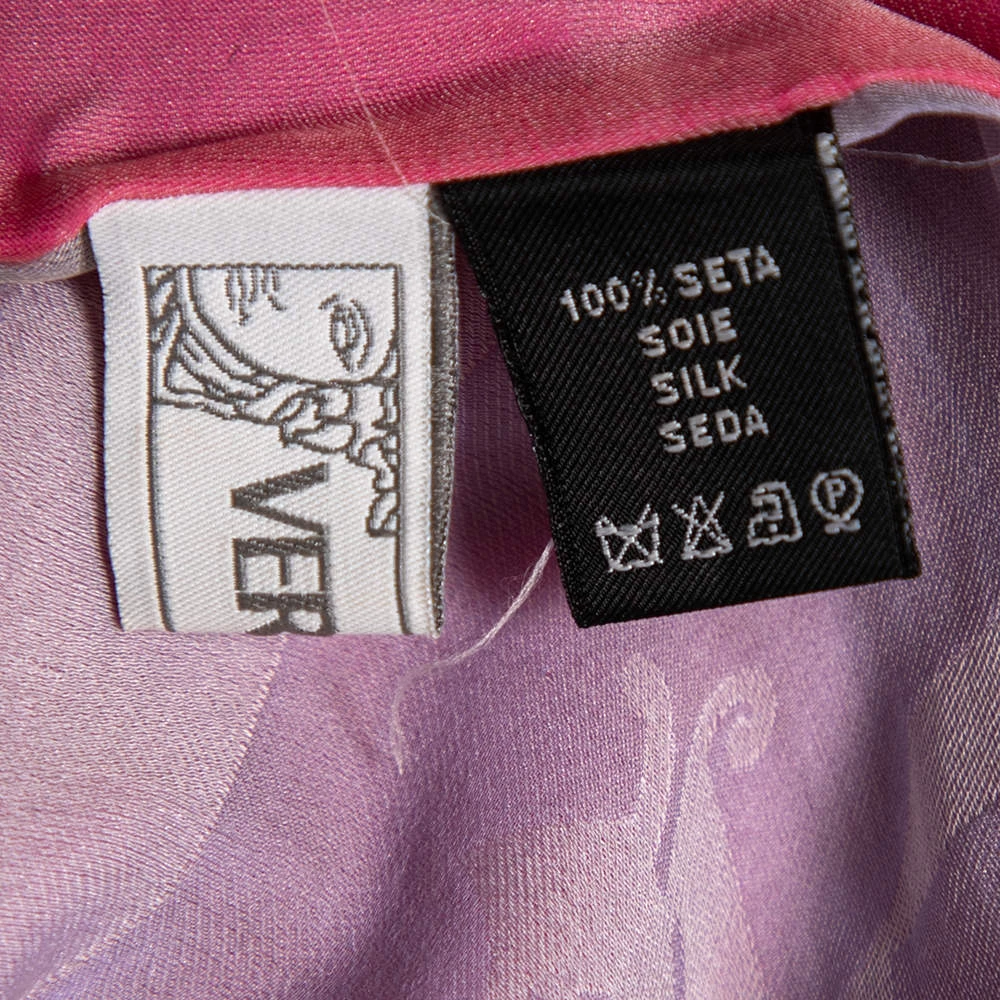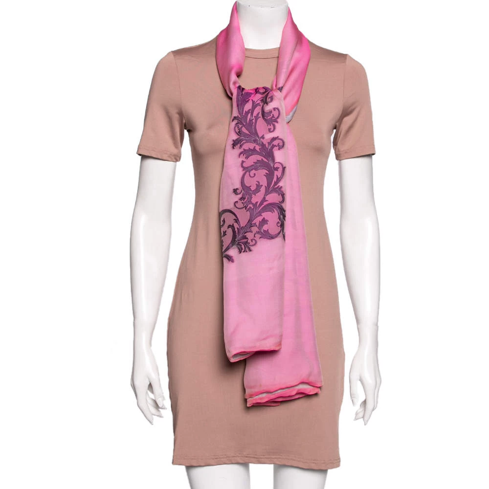 Presented by the House of Versace, this scarf is a beautiful accessory that will make you look polished and stylish! It is made from pink and lavender logo printed Fil Coupe silk fabric. This scarf has a length of 180 cm. Add this creation to your collection today!
