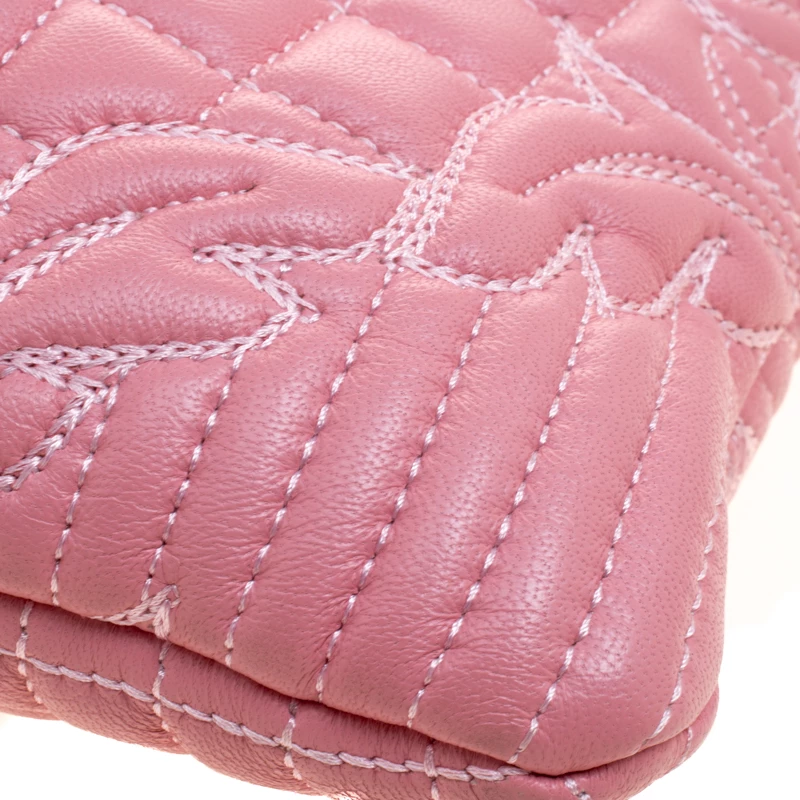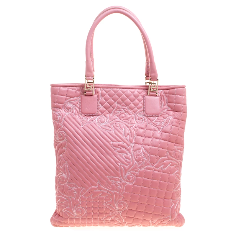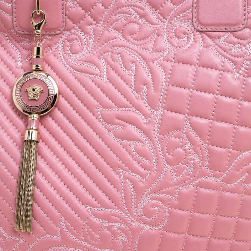 Swing with pride this pretty pink tote that comes crafted from leather and designed with luscious embroidery. The bag is from Versace and it has a spacious satin interior, two top handles, and a detachable charm.