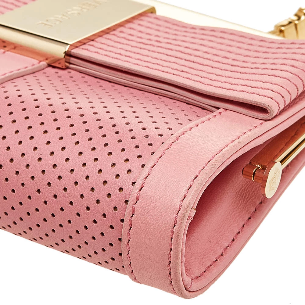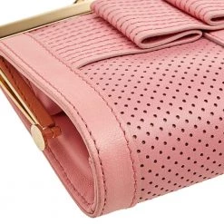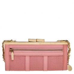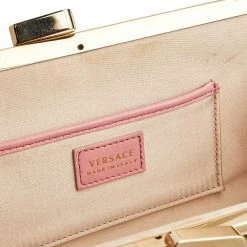 This clutch from Versace has an appealing design, perfect to complement an evening dress or a party ensemble. Crafted from pink leather and gold-tone metal, the creation features a bow embellishment, a well-lined interior, and a woven chain strap.