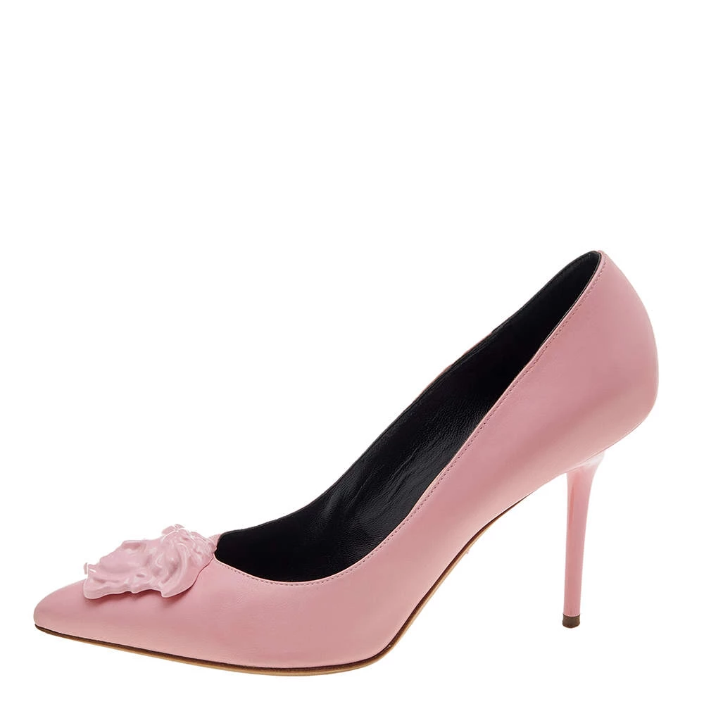 This pair of Versace pumps are a style statement with a timeless design. Crafted from pink leather, they feature pointed toes accented with the iconic Medusa motifs in a matching pink color. They are complete with slender heels and sturdy leather soles.