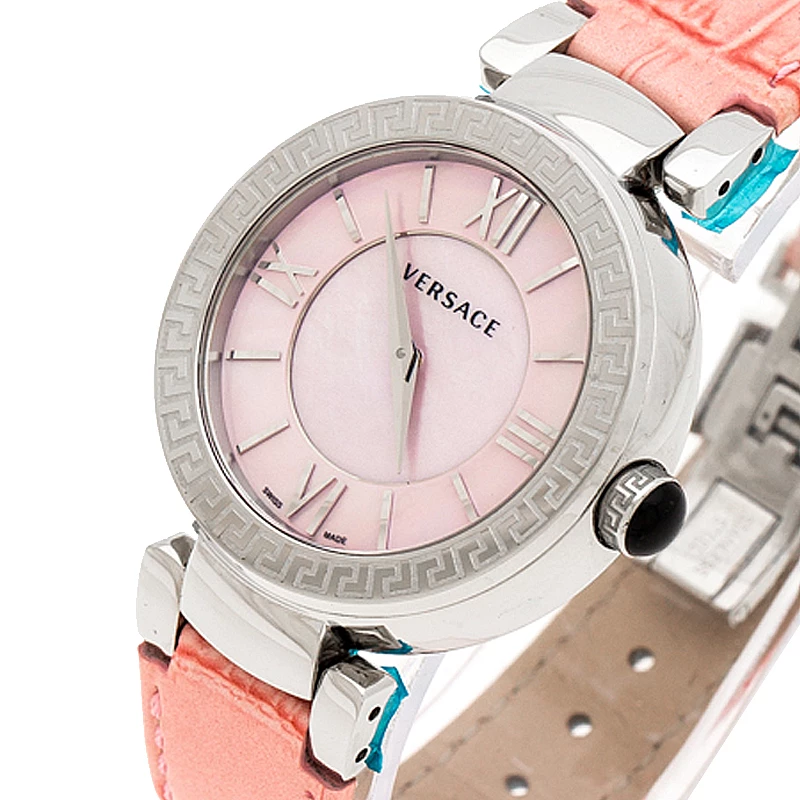 Versace offers designs portraying grand style with everything eye-catching and this Leda VNC from the label demonstrates just that. The watch is made of stainless steel and held by leather straps. It is graced with a stylish bezel detailed with signature Greek key symbols and fitted within is a Mother of Pearl dial with Roman numeral hour markers. This quartz watch has water resistance up to 50 meters and will look gorgeous on your wrist.