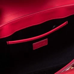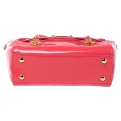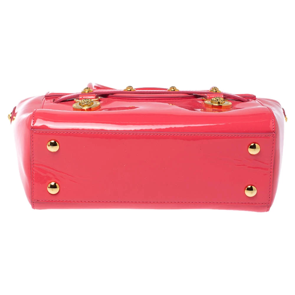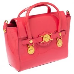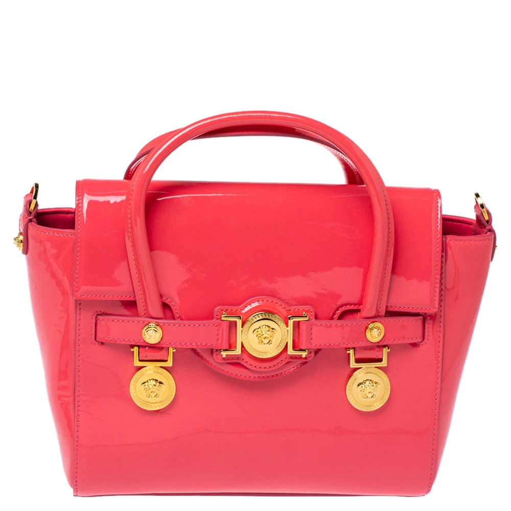 Sophisticated and luxe, this bag from Versace definitely needs to be on your wishlist. The bag is crafted from patent leather in a lovely pink shade, and it features a structured silhouette. It flaunts dual handles, a removable shoulder strap, and the famous Medusa logo on the front. The spacious satin interior houses slip pockets.