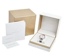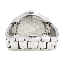 Let this impressive wristwatch by Versace adorn your wrist and grant you a touch of luxury. It is made from stainless steel and on its pink dial, there are hour markers, a date window, and the Medusa head at the 12 o’clock position. The bezel shows the signature Greca engravings, a feature that enhances its design and is finished with a push-button clasp.