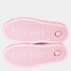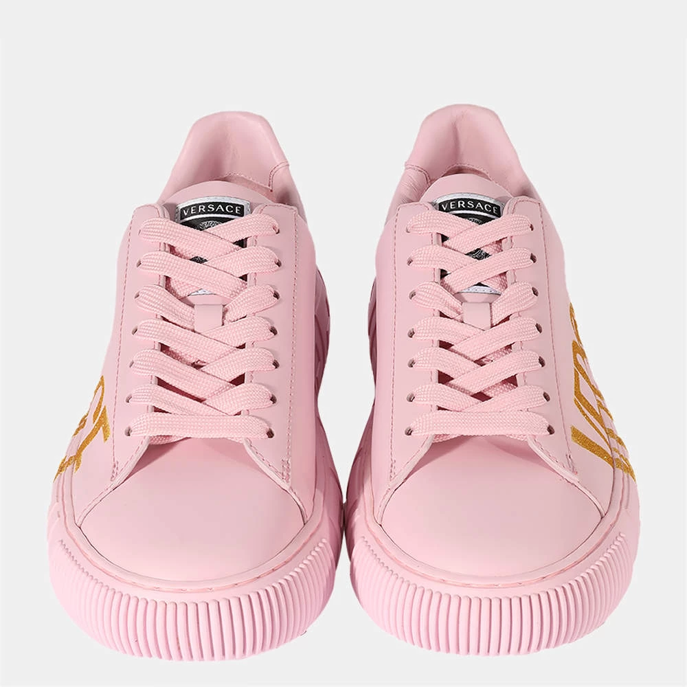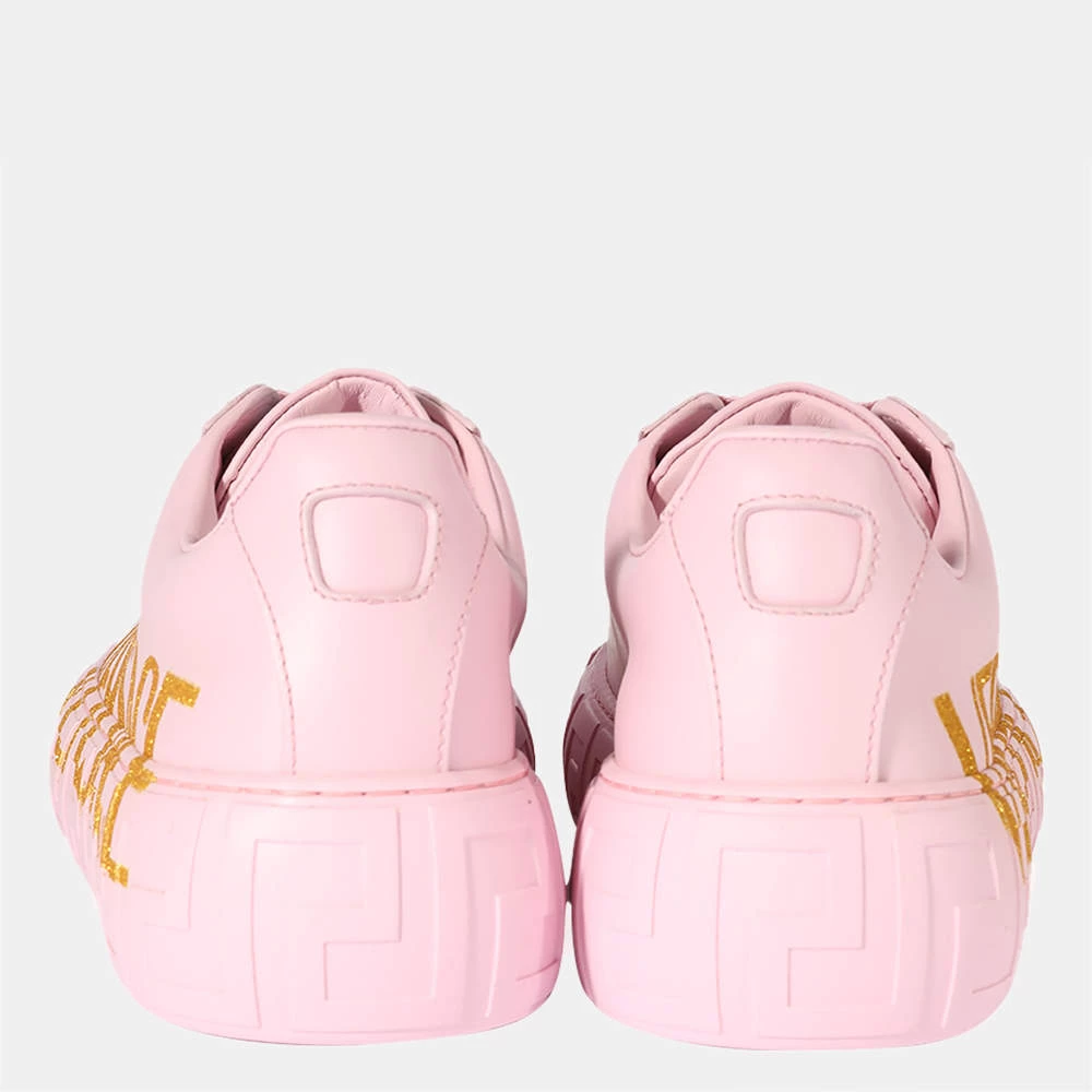 Embrace everyday chic styling with these attractive Versace low-top sneakers. Distinguished by sleek, clean lines, this stylish pink pair features a leather upper, a lace-up front, the graphic Greca pattern on the midsole, a lateral logo in a golden hue, and a hidden Medusa on the outsole at the heel.