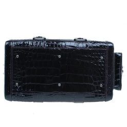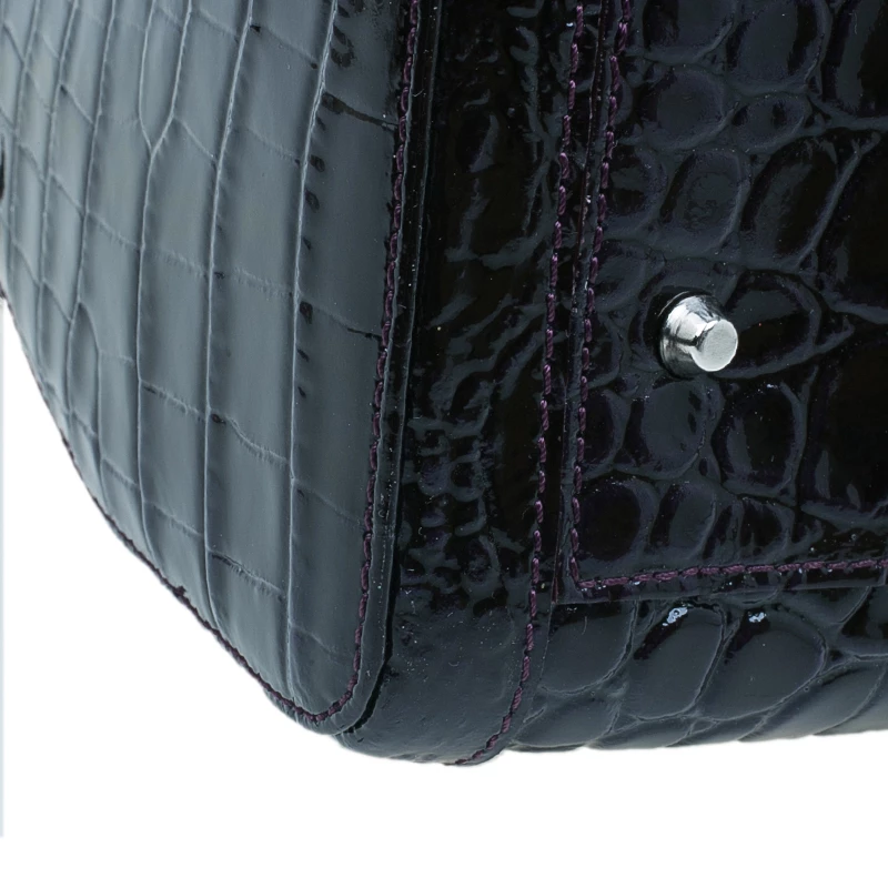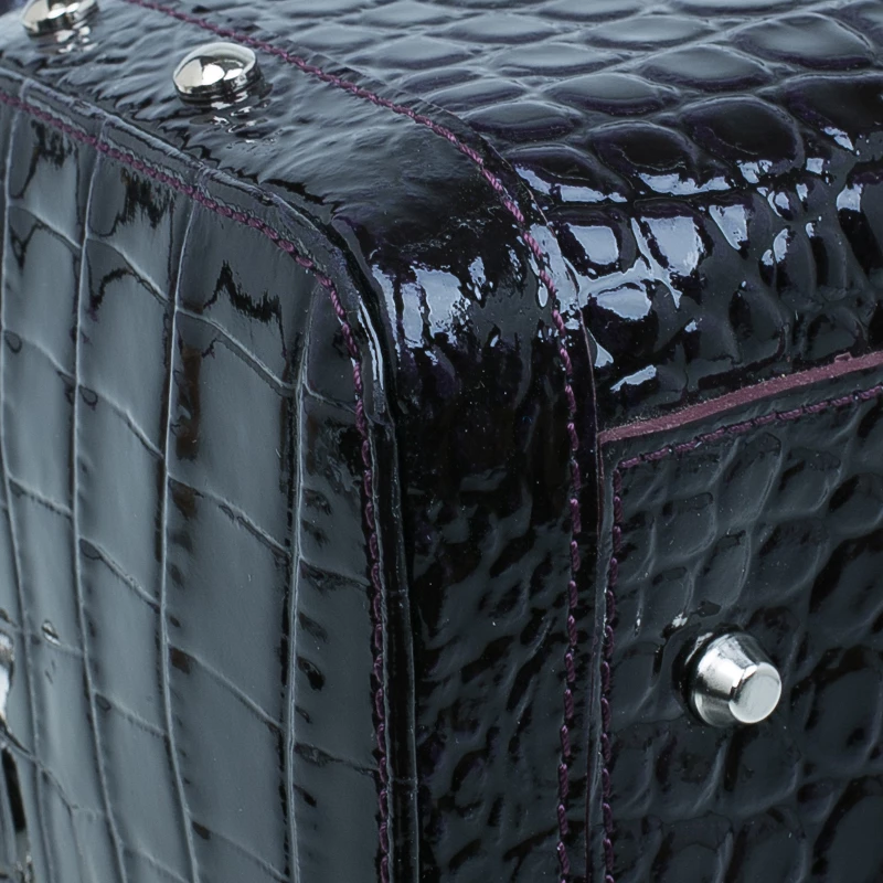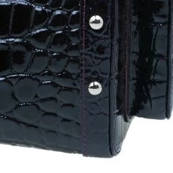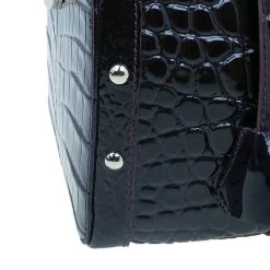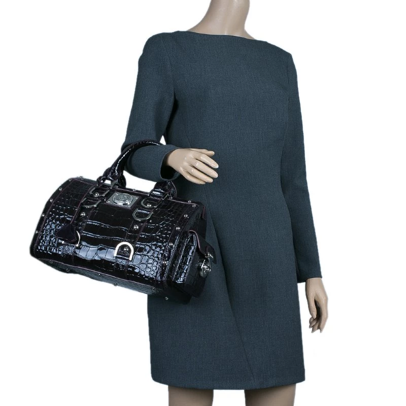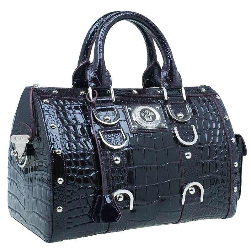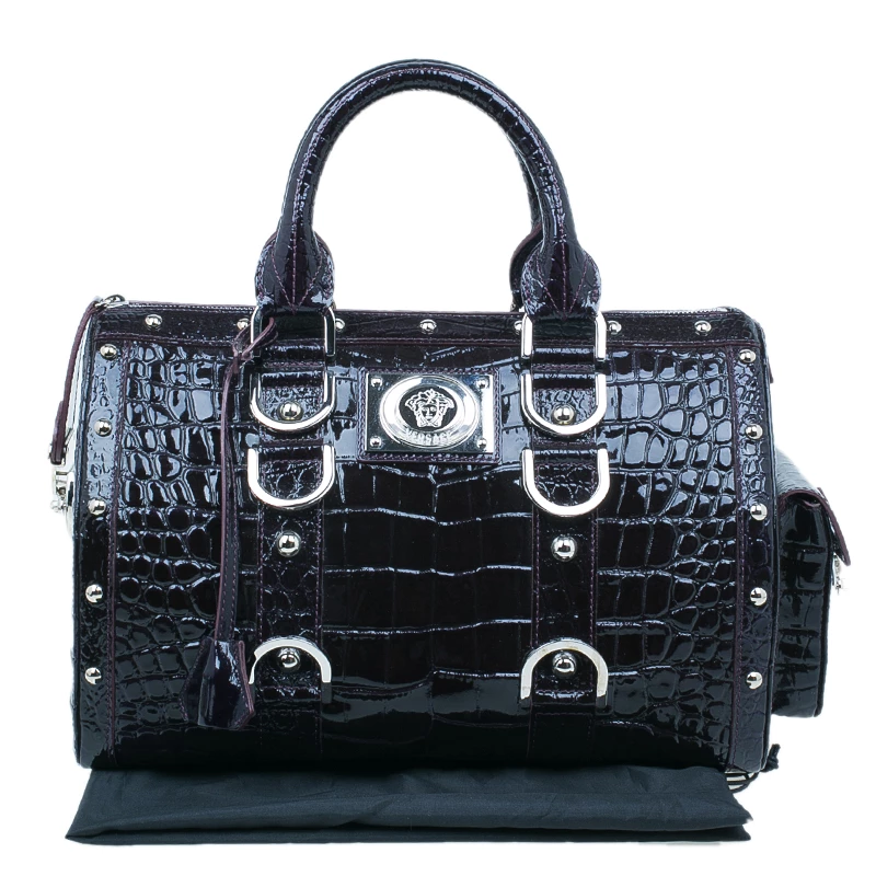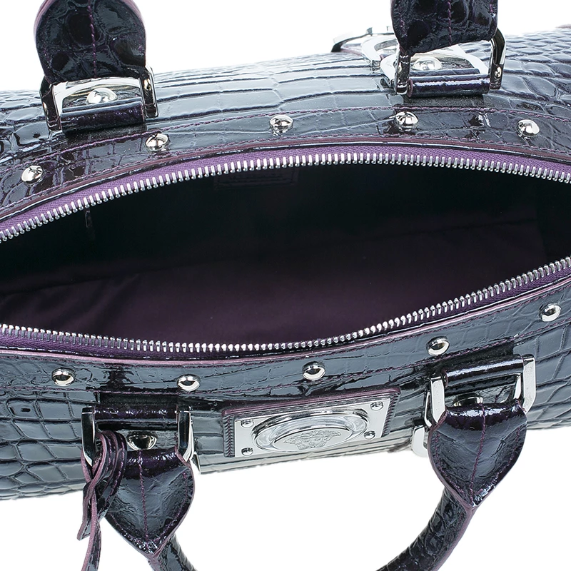 This over the top Versace Snap Out Of It satchel is a bold statement-making bag from the fashion-forward Italian label. Crafted from purple croc embossed patent leather, it is accented with rolled double handles, a Gianni Versace Couture plate, a side pocket, and silver-tone studded hardware. The interior is lined with satin and features a zip pocket. It will bring just the right amount of glamour to understated evening ensembles.