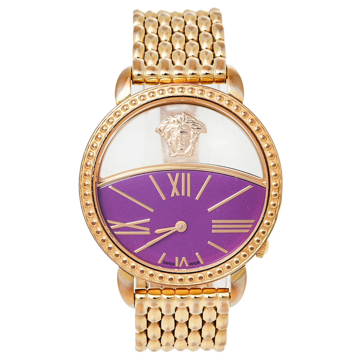 Creations from Versace promise a grand style with everything eye-catching and this Krios watch from the label demonstrates just that. The watch has a gold-plated stainless steel case and a link bracelet secured with a concealed clasp closure. It is graced with a stylish hobnail bezel and fitted within is a purple and partially transparent dial. The dial is graced with a notable Versace Medusa logo on the transparent part along with Roman numeral hour markers and two hands. This quartz watch has a water resistance of up to 30 meters and will look gorgeous with your evening ensembles.