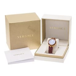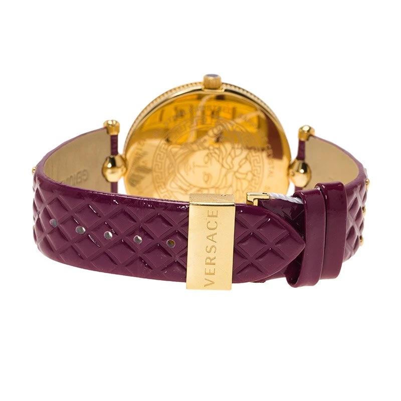 This wristwatch is a member of the famous “Vanitas” collection from Versace. This purple toned wristwatch exceptionally flatters the gold-plated stainless steel case and hardware. The feminine attributes are meticulously reflected through its remarkable design. Wear yours at a select occasion.