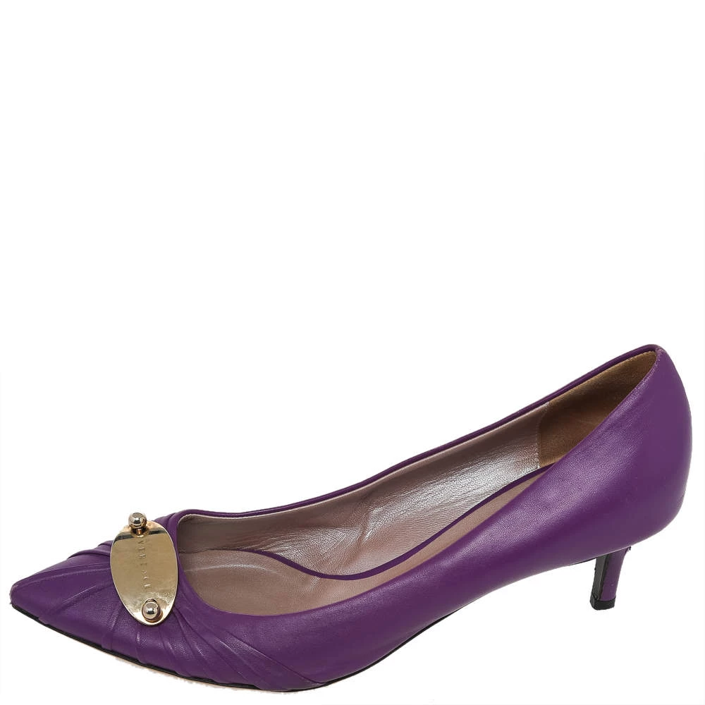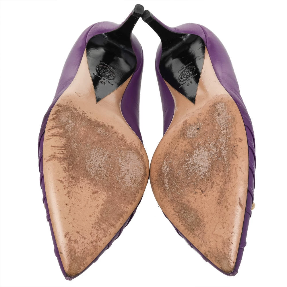 This pair of chic pumps by Versace is the standard of sophistication. It is designed from leather, with utmost precision. These pumps are supported with leather on the insides and make a fashionable and comfortable fit. This pair of purple pumps will add a classic touch to your wardrobe.