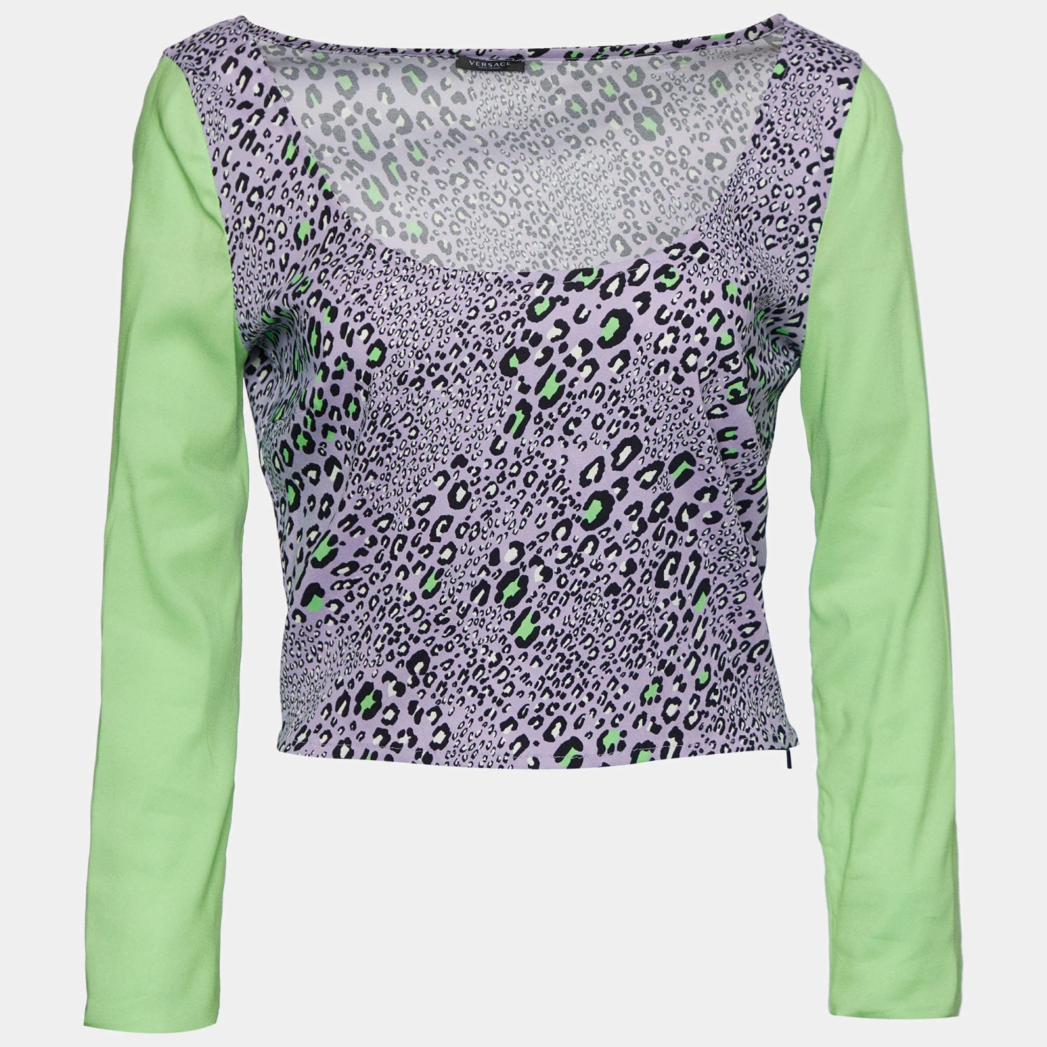 This crop top from the House of Versace is here to make you look fashionable. It is tailored using purple knit fabric, which is enhanced with leopard prints. It showcases a cropped fit and long sleeves. Wear this Versace top with high-waisted pants or denim for casual outings.