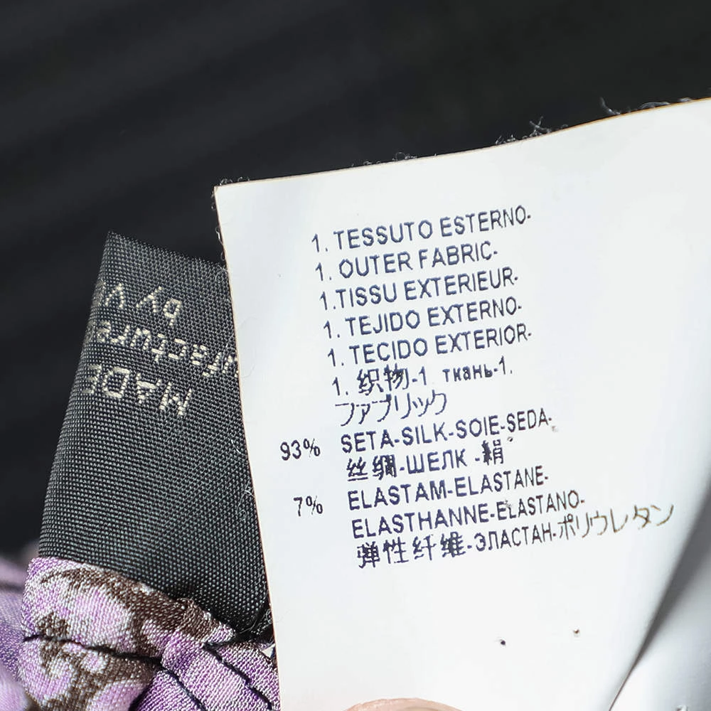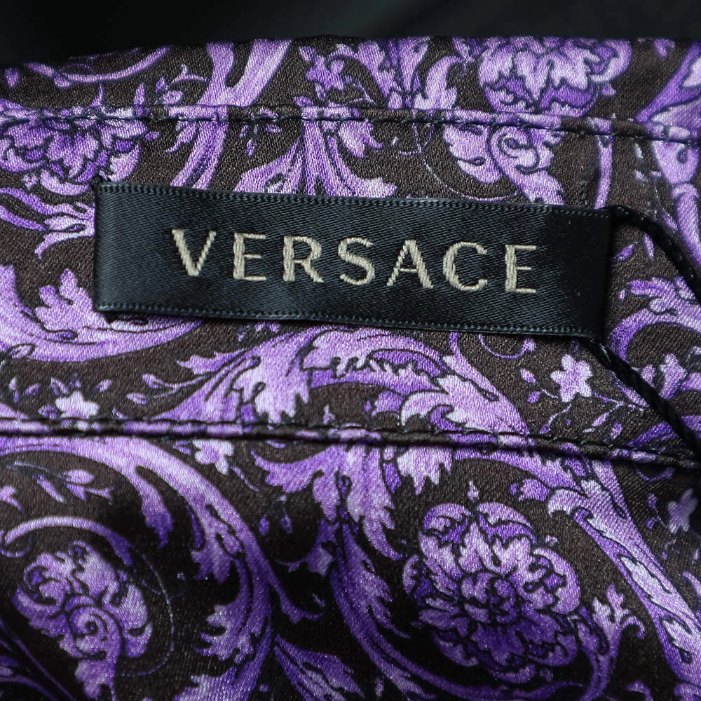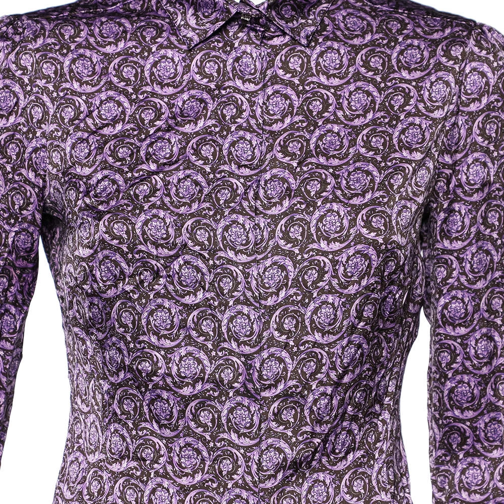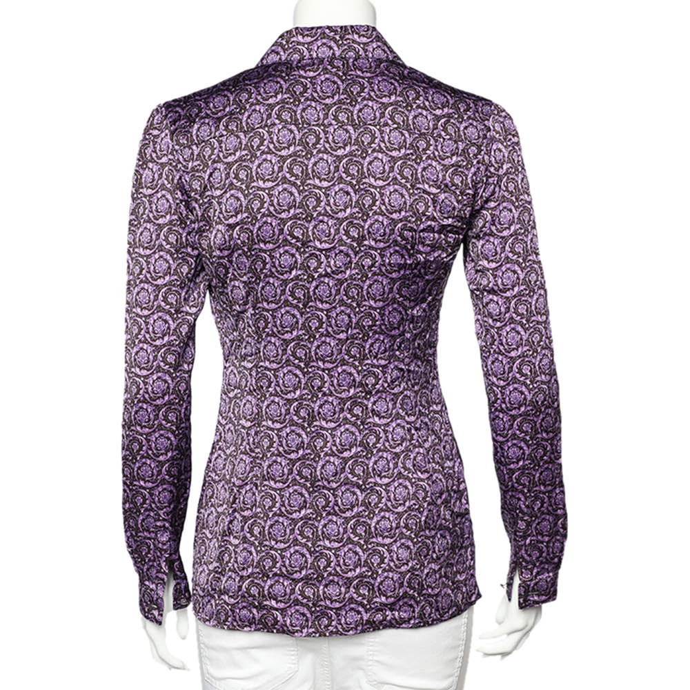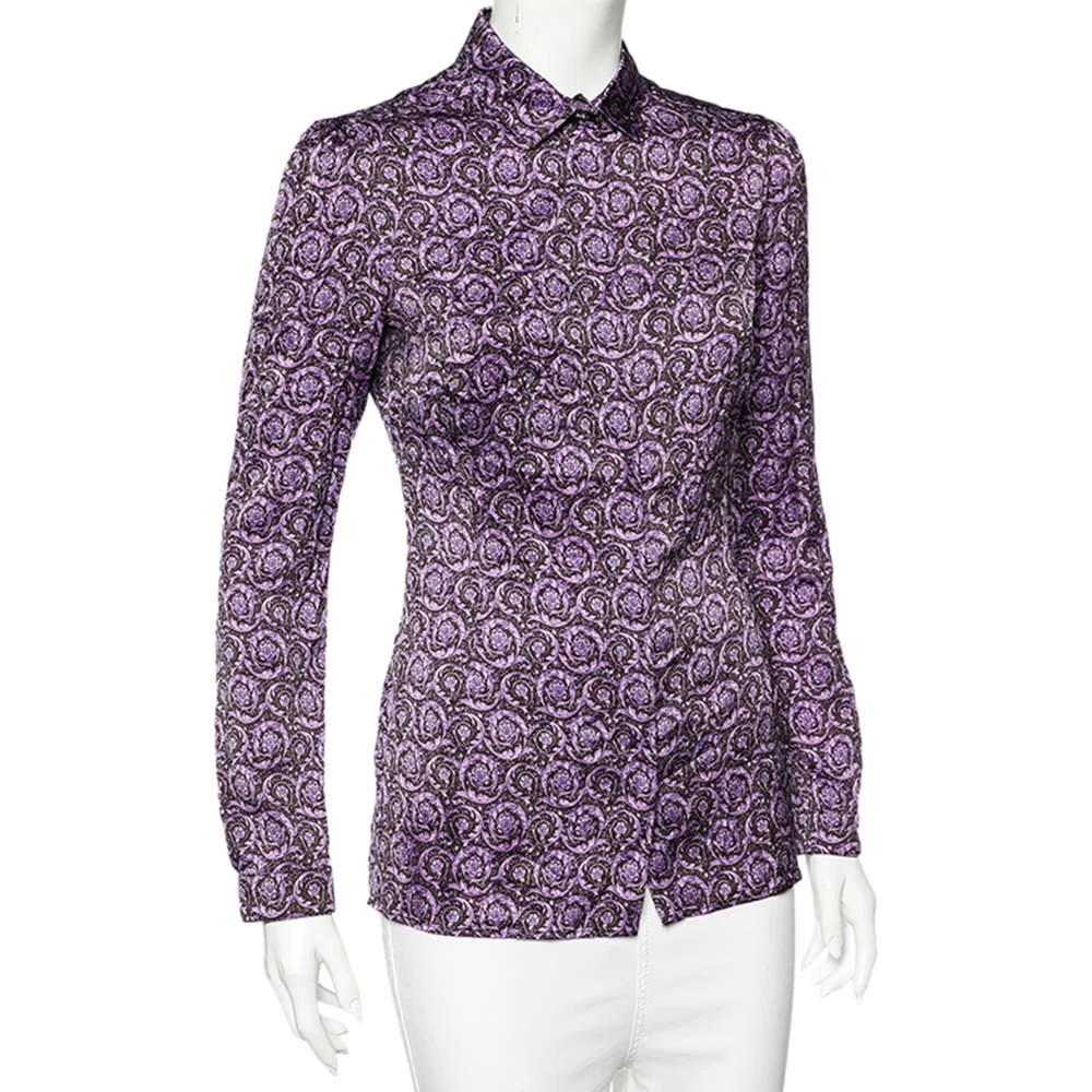 Tailored with precision using a silk blend, this purple shirt from Versace will be a staple addition to your closet. It features long sleeves, full front buttons, and prints all over. It will complement both skirts and pants.