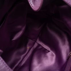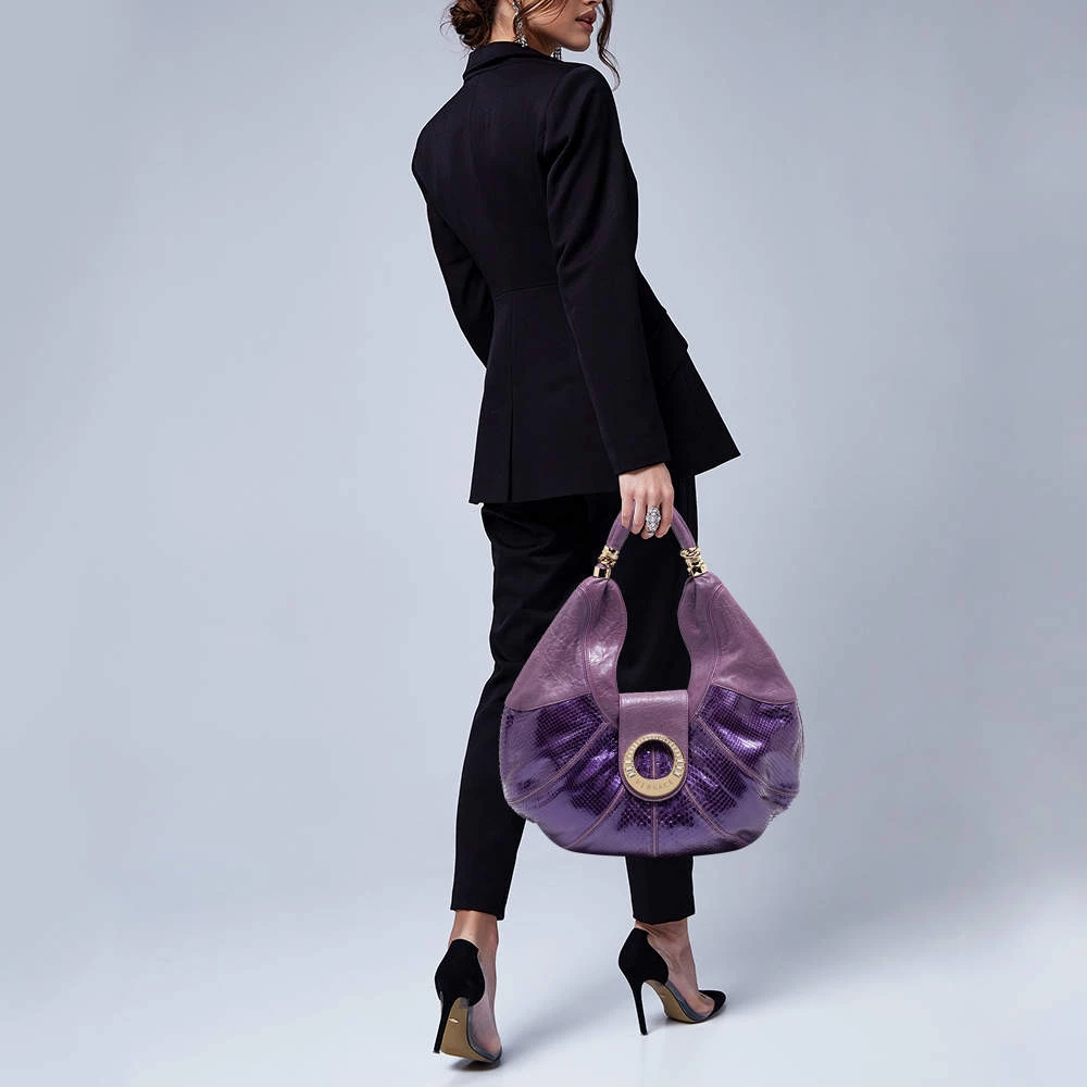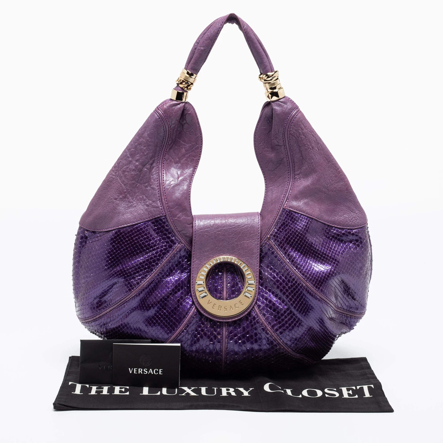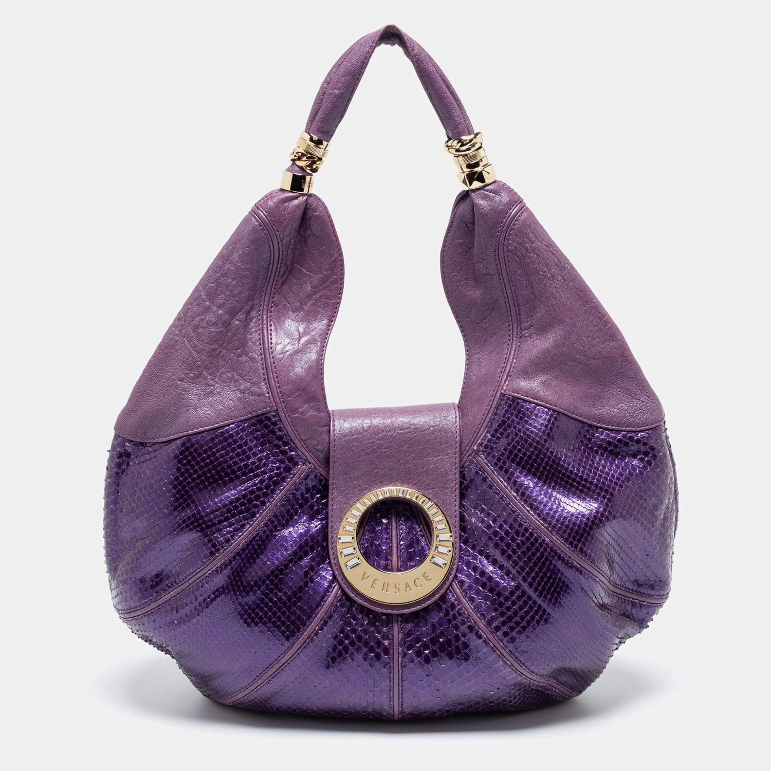 Spacious and captivating, this hobo comes from the House of Versace. It has been crafted from purple snakeskin and leather, with a crystal-embellished accent placed on the front. It features a single handle, gold-toned hardware, and a satin-lined interior. Make this stunning hobo yours today!