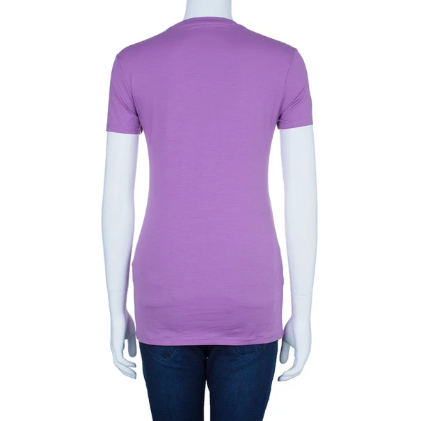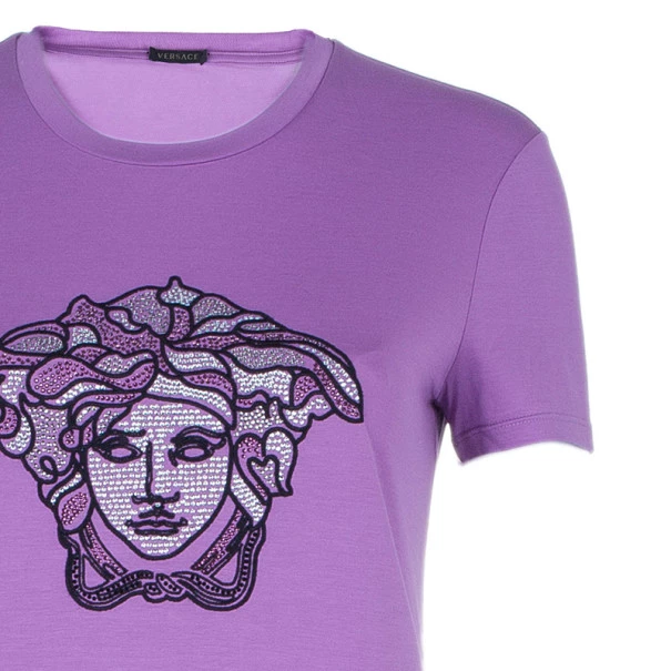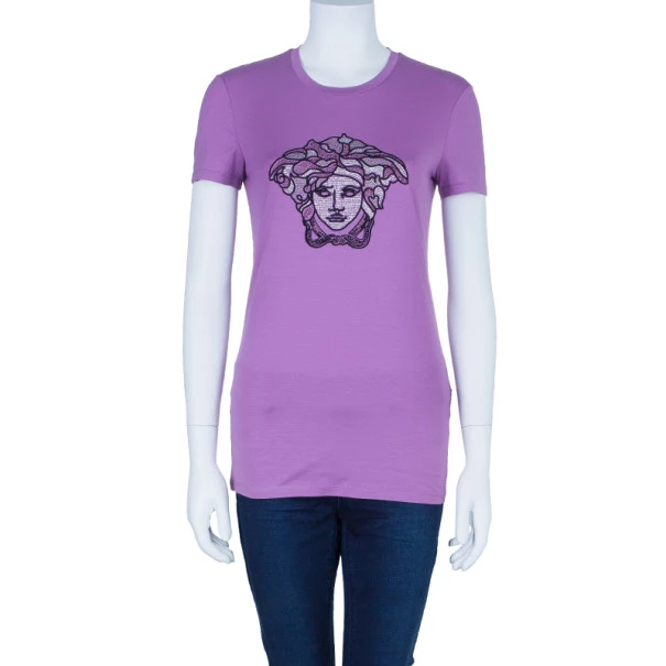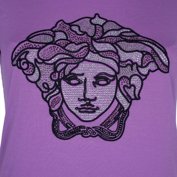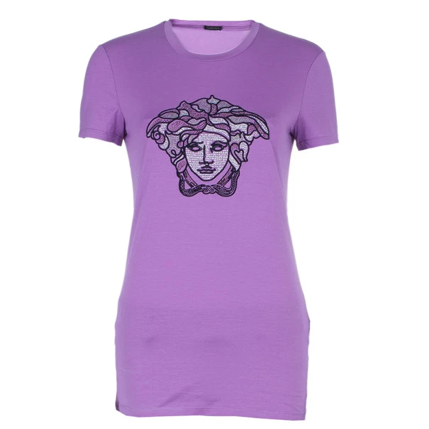 This studded Versace Medusa T-shirt features short sleeves and a round neck. This fun top is highlighted with a studs arranged in an eye-catching Medusa head at the chest. The trim-tailored T-shirt is cut from soft stretch cotton. Pair it with your denims and sneakers for an ultra stylish sporty look!