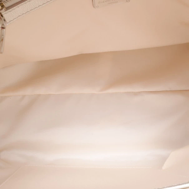 This over the top Versace Snap Out of It satchel is a bold statement making bag from the fashion forward Italian label. Crafted from light gold quilted Versace logo leather, it is accented with braided handles, a Gianni Versace Couture plate, side pocket, silver studs and hardware. The interior is lined with fabric and features a zip pocket.Celebrities seen carrying the Quilted Snap Out of It Satchel include: Britney Spears, Avril Lavigne and Kimora Lee Simmons.