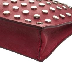 This striking shoulder bag hails from the iconic house of Versace. Crafted in Italy, it is made of quality leather and flaunts a lovely shade of red. It is held by a single handle and features a lovely silhouette. The front has been beautified with silver-tone studs. It is equipped with a zip closure that reveals a fabric-lined interior with a slip pocket. It is finished with a brand logo on the back and silver-tone accents.