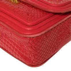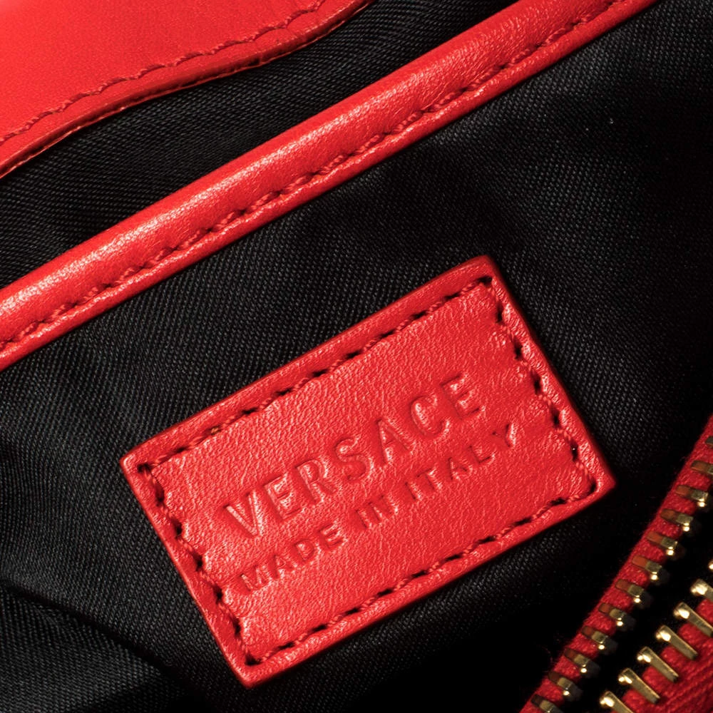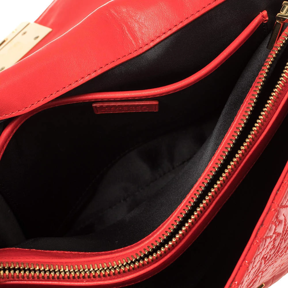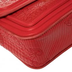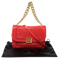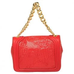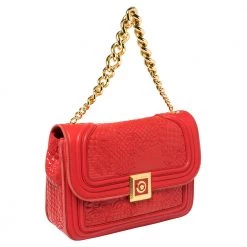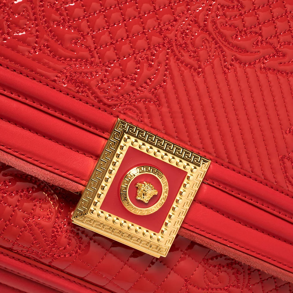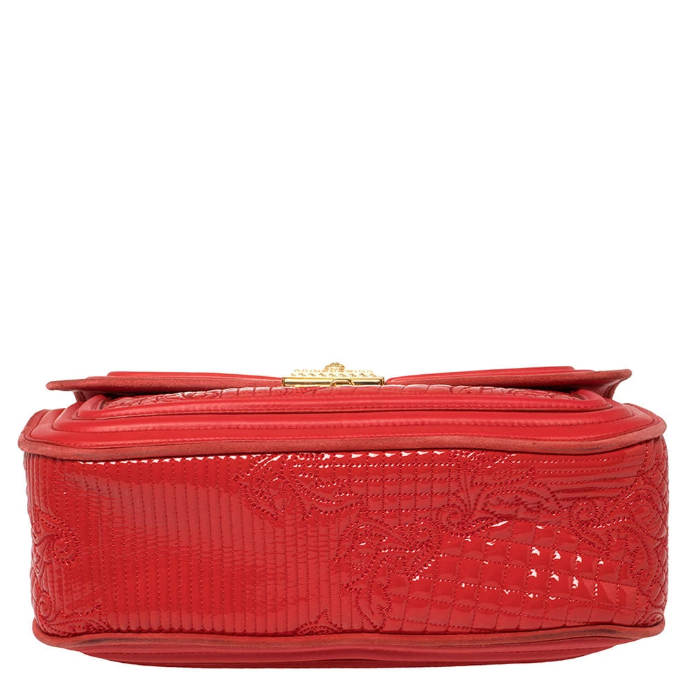 Make a striking appearance with this fashionable shoulder bag by Versace. This elegant creation is at once a fashion statement as well as a rational necessity. It is crafted from leather, patent leather & suede and is adorned in a quilted pattern all over along with a gold-tone signature Medusa motif. Lined with satin, it has a spacious interior where you can stow your basics. This pretty piece is complete with a shoulder strap.