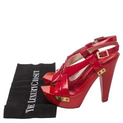 Versace yet again brings a stunning set of sandals that makes us marvel at its beauty and craftsmanship. Crafted from glossy patent leather in a red shade, they are adorned with open toes and block heels supported by platforms. There are endless ways to style these beauties.