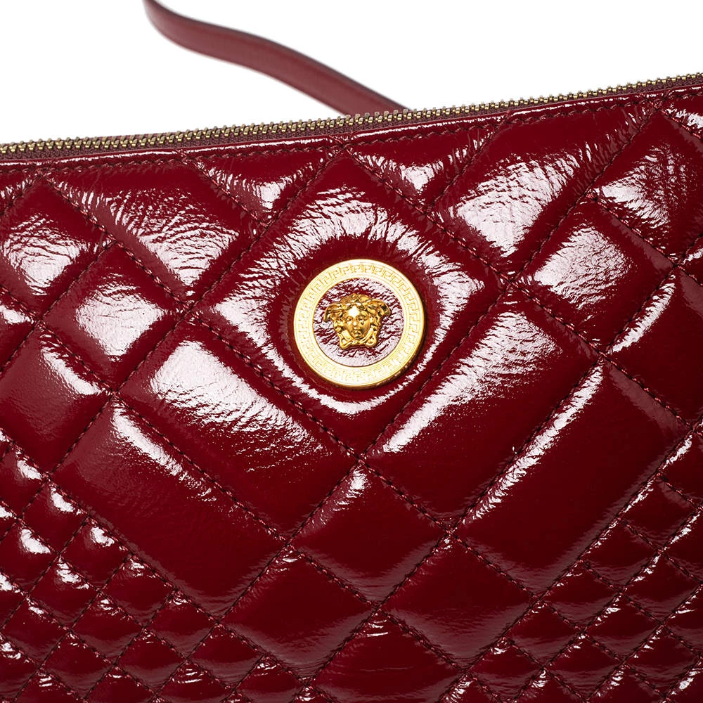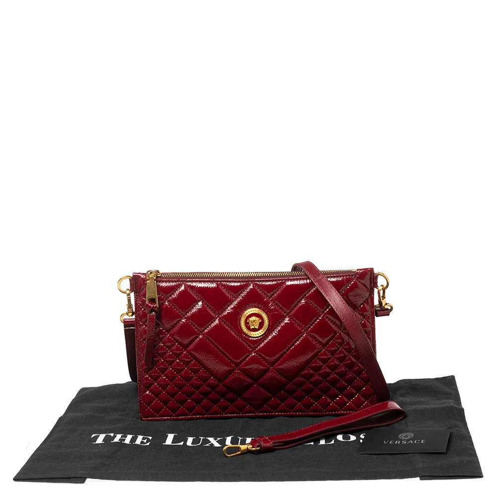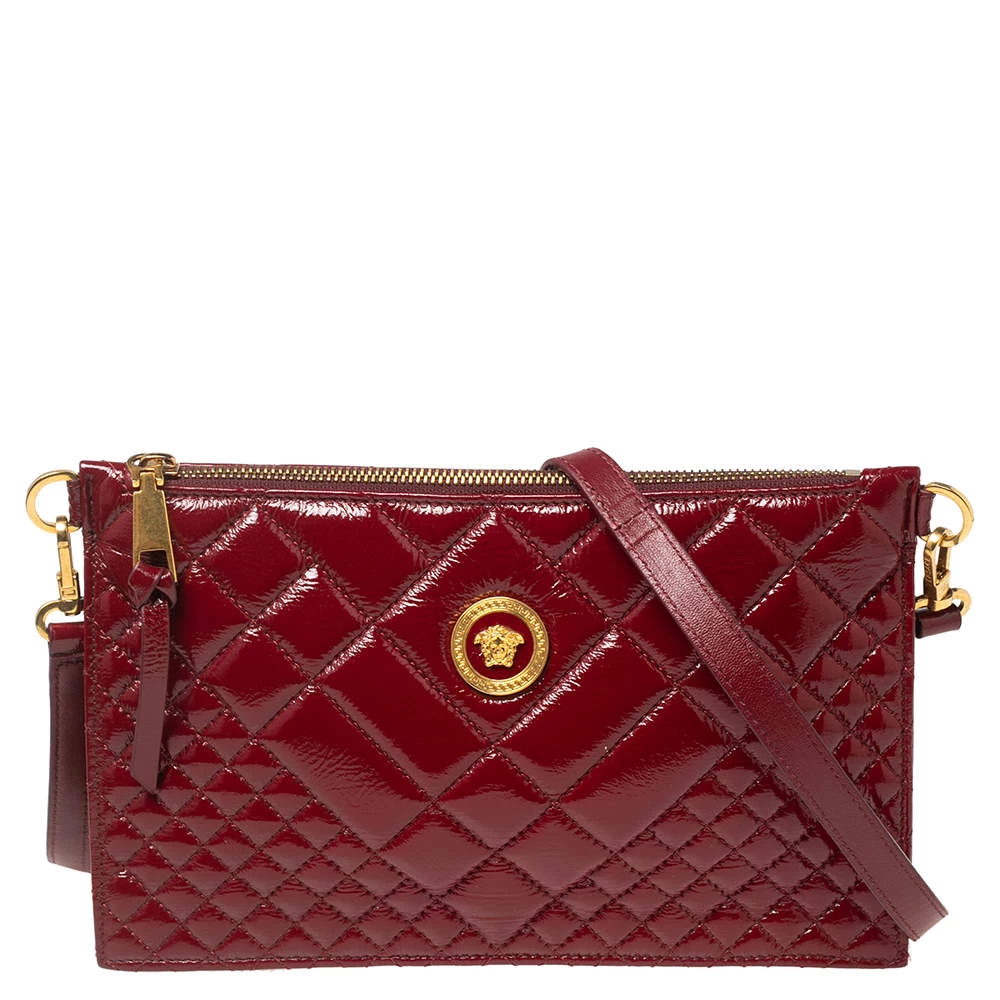 This crossbody bag from the House of Versace is made to offer elegance and luxury. It is designed using red quilted patent leather with a gold-toned Medusa accent perched on the front. It has a fabric-lined interior and a shoulder strap. Carry this Versace bag and look stunning!