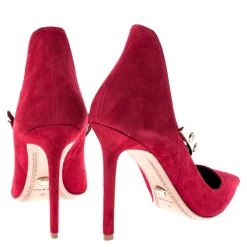 Made from suede, these pumps are a splendid example of luxury and class. Have everyone talking about your amazing sense of style when you walk in this pair from Versace. The classic red, the gold-tone cuff detail, the slim heels and the raised counters help make this pair fashionable.