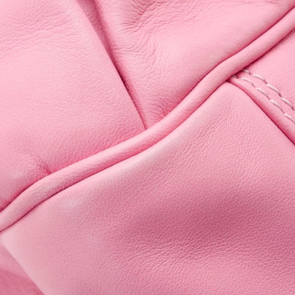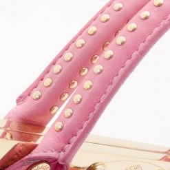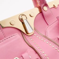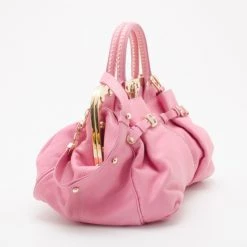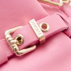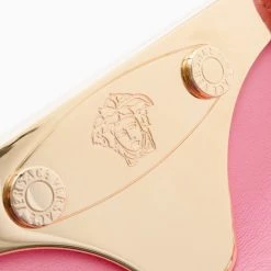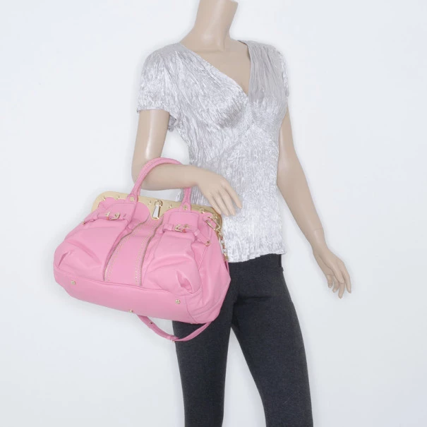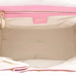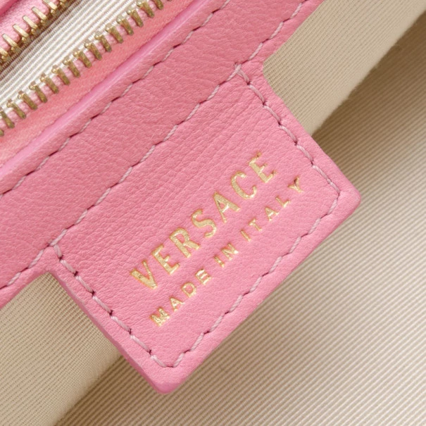 This Satchel is a fashion forward piece from Versace that is both edgy and feminine. This framed satchel has a smooth pink leather exterior. It is detailed with gold framed snap top closure with engraved Medusa logos, it has pleated front buckle accented pockets, gold zipper trim, gold studs, rolled leather handles and removable shoulder strap. The large interior is lined with beige canvas that features zip pocket and two patch pockets.