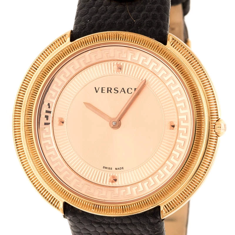 Simplicity and elegance find their way into a perfect combination with style and glamour to complete this stunning watch by Versace. Crafted out of rose gold-plated stainless steel and held by leather, this quartz watch features dot hour markers, two hands on the dial and two medusa studs on the straps. It will always help you be on time.