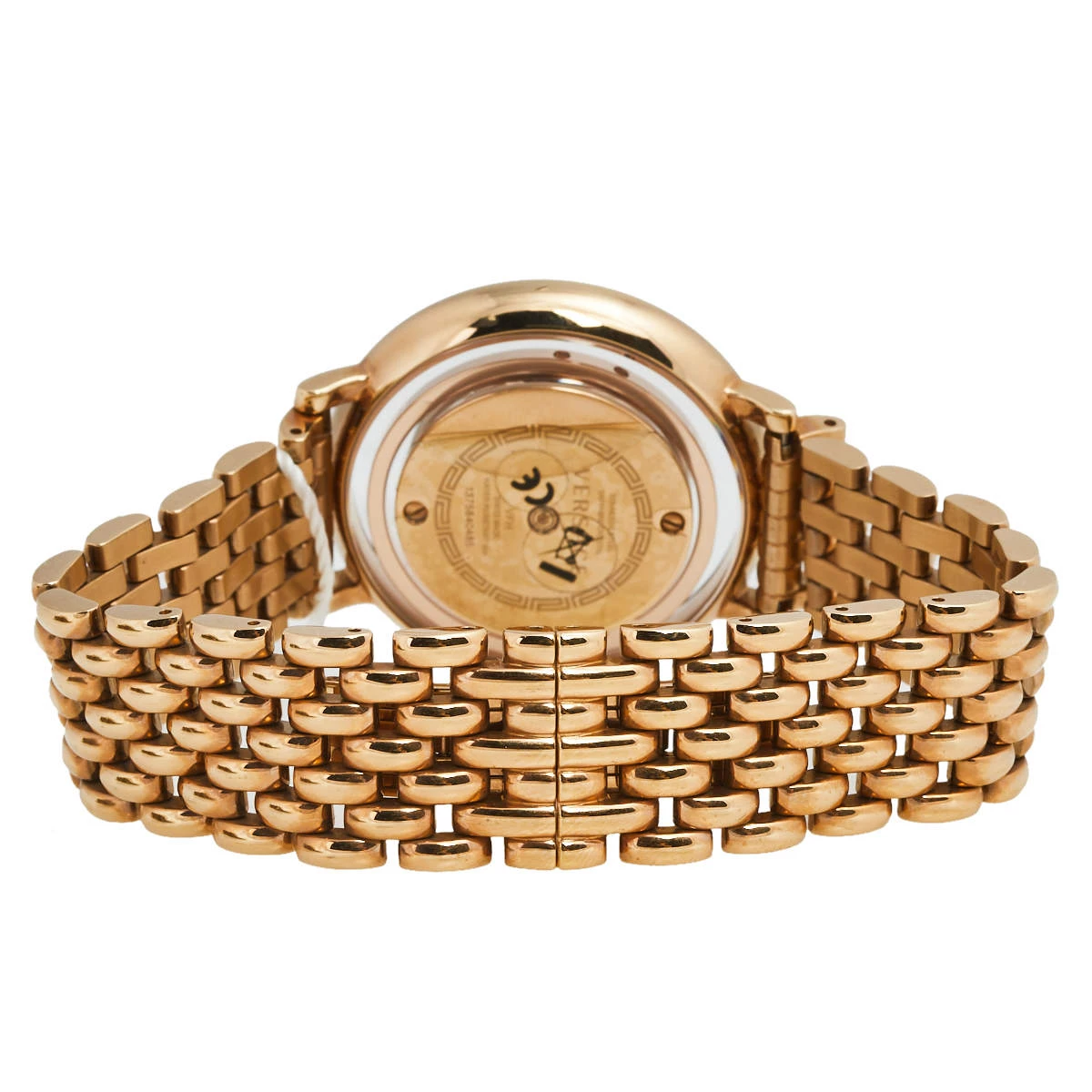 This beautiful timepiece from the house of Versace is sure to be a conversation starter with its eclectic and eye-catching design. Constructed in rose gold-tone stainless steel, this Venus watch features a transparent panel around the case and one of the rims holds a single pink crystal. The dial is set with stud markers, the iconic Medusa logo, and two hands.