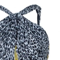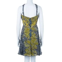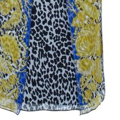 This chic halter neck dress by Versace has a leopard print with a flowery vertical pattern in the front in yellow. The flair gives this dress a unique look. The dull yellow goes superbly well with the dark base print. A quick pick for any day break!