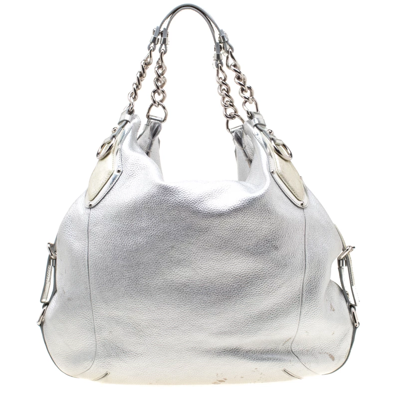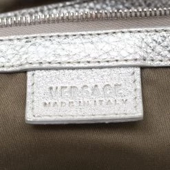 Crafted from silver leather, this hobo from Versace is designed with minimal style details but with high attention to craftsmanship. The hobo features dual chain handles and silver-tone hardware. The spacious interior of the bag is lined with satin and houses a zip pocket.
