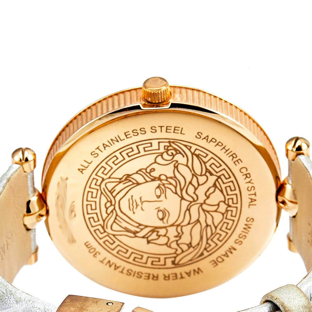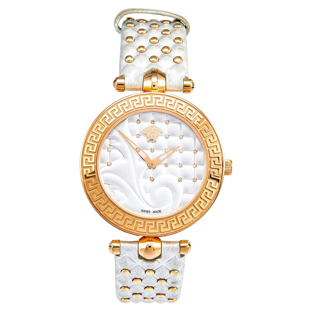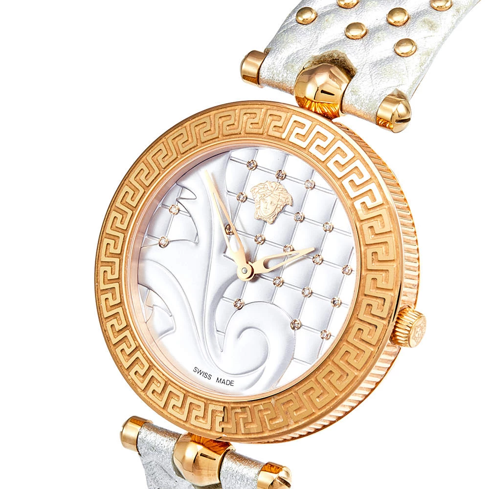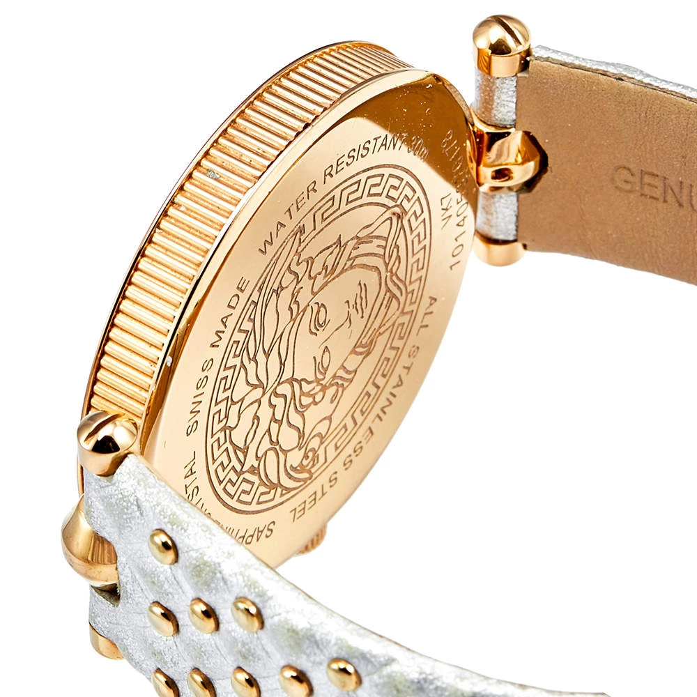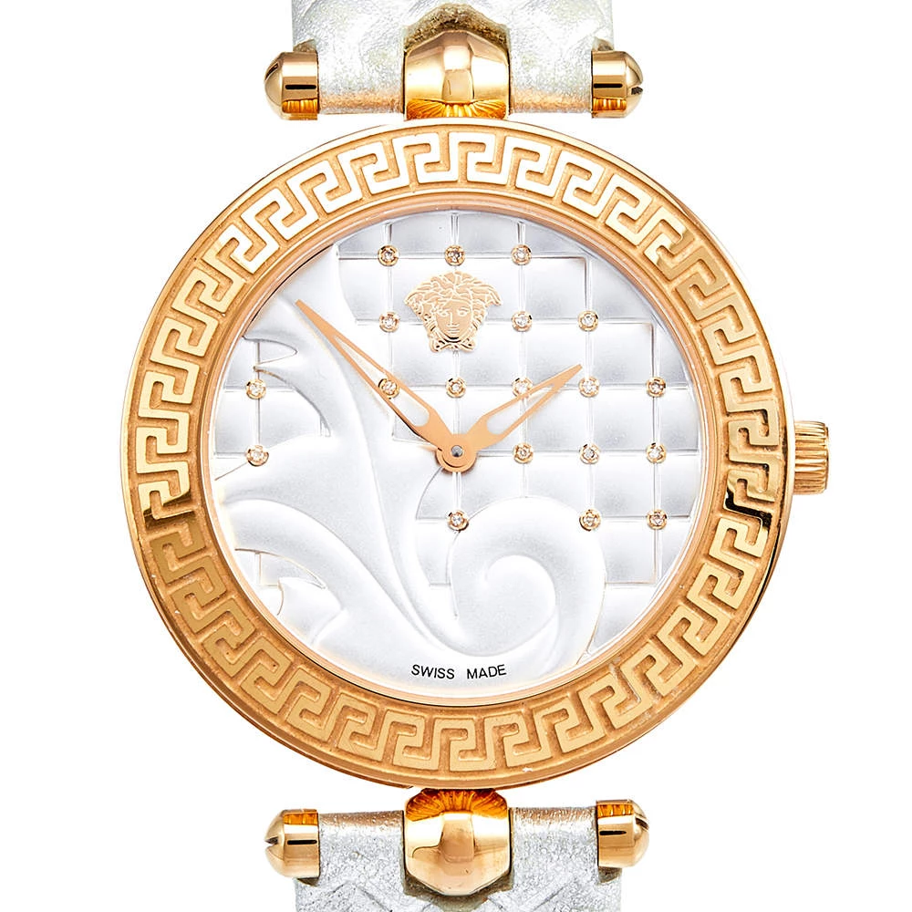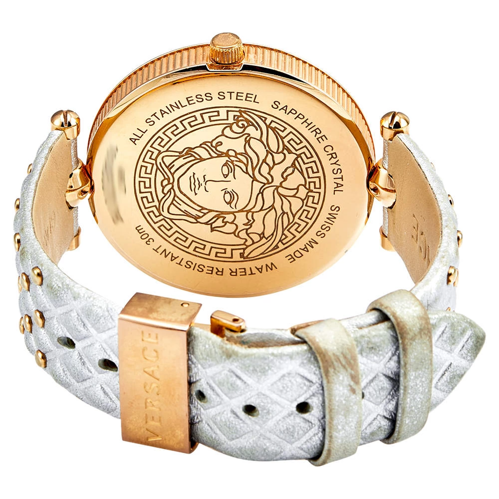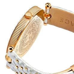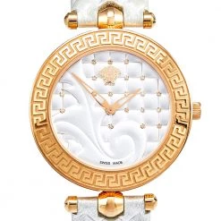 This wristwatch is a member of the famous “Vanitas” collection from Versace. The silver and gold colors on this watch create a hard-to-miss look. The watch is made from rose gold-plated stainless steel and held by quilted leather straps. The bezel features Greca engravings and the baroque-inspired quilted dial continues the theme of gold studs and the instantly recognizable Versace logo. It is secured by an engraved clasp fastening.