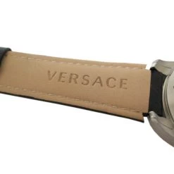 This Versace wristwatch boasts of the skilled watchmakers of the luxury brand. The white textured dial is equipped with luminescent bars, three hands and a date window. This water resistant timepiece showcases a stainless steel case and a case back and a black leather strap that fastens on the wrist with a fold over clasp.Original Retail Price: US $2,200