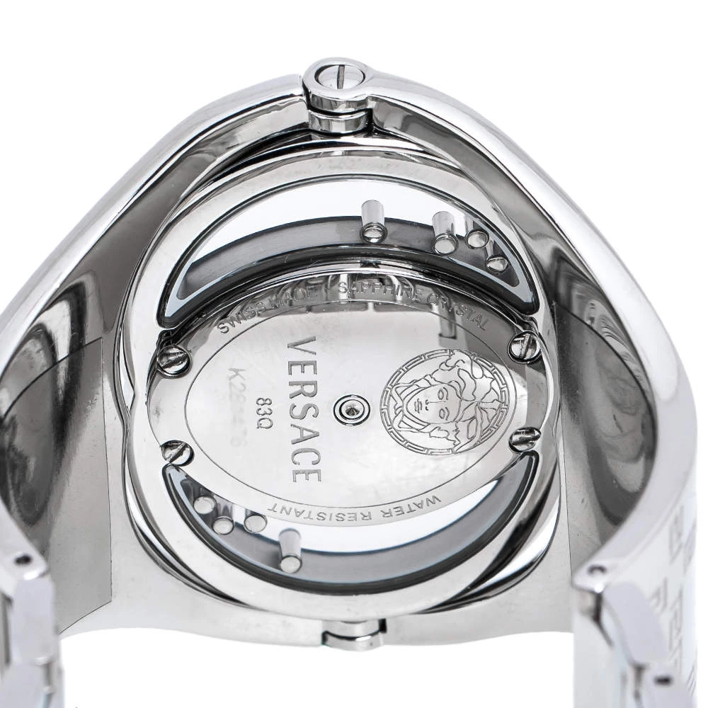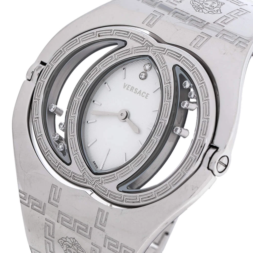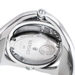 This Versace stainless steel wristwatch will surely be an upbeat addition to your style. The watch has a design of two overlapping circles and the silver dial resides within the vesica piscis (the area of intersection). On the dial, there are stick hour markers, two hands and two sparkly stones at the 12 o’clock position. The diamonds encased on the sides of the dial are so placed to sparkle with every twist of your wrist.