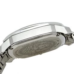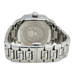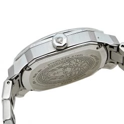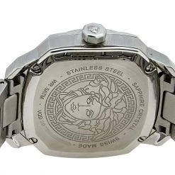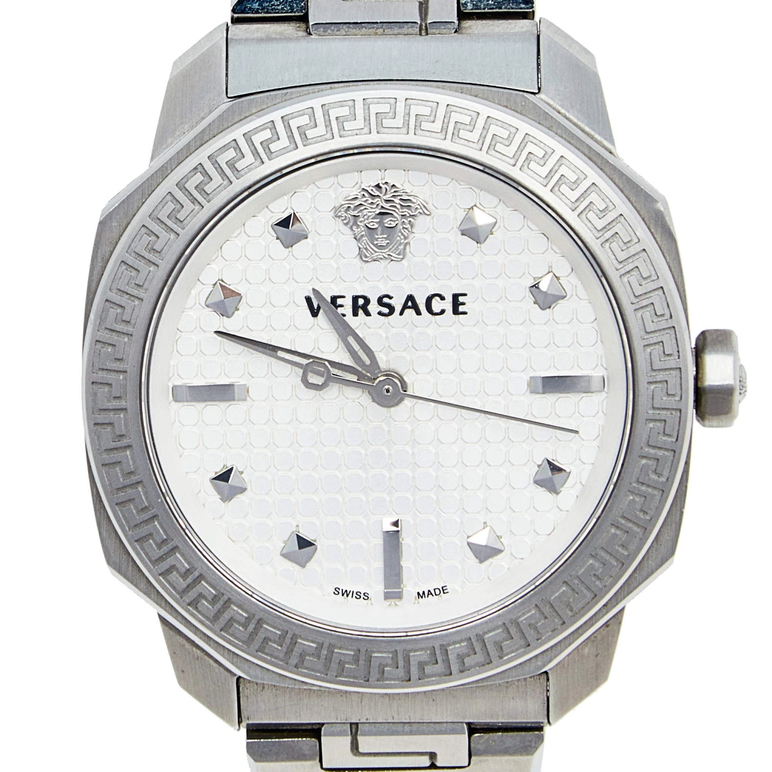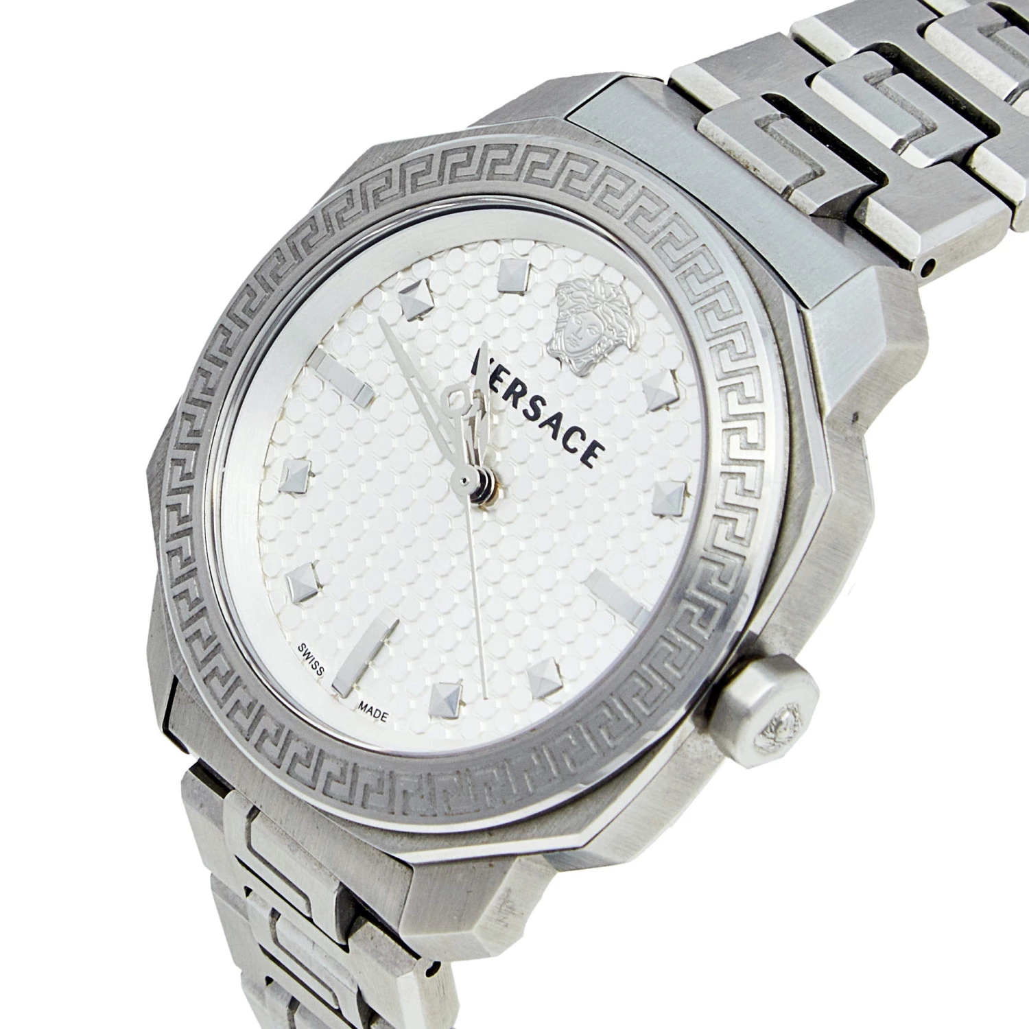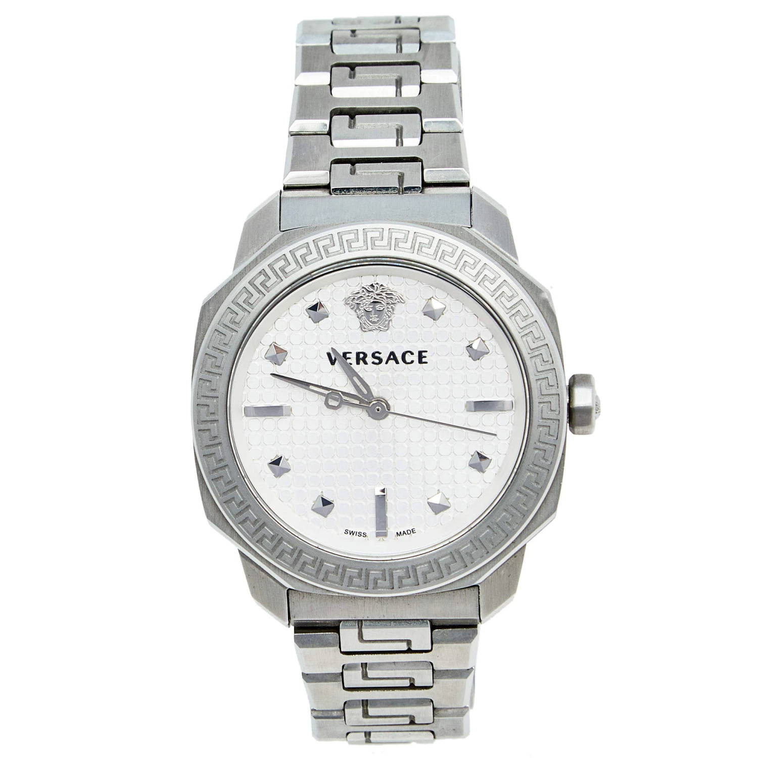 This Versace Dylos quartz watch is an ideal choice for everyday use. Made from stainless steel, it features Greca key detailing on the bezel, textures and steel markers on the silver dial, and a simple push-button clasp to the comfortable bracelet.