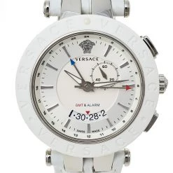 Let this Versace watch keep you on time and add to your everyday style. The stainless steel watch comes with a silver dial set with distinct markers, a date window, GMT & alarm. The leather bracelet of this quartz watch offers a comfortable fit.