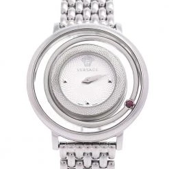 This beautiful timepiece from the house of Versace is sure to be a conversation starter with its eclectic and eye-catching design. Constructed in stainless steel, this Venus watch features a transparent panel around the case and one of the rims holds a single pink crystal. The dial is set with stud markers, the iconic Medusa logo, and two hands.