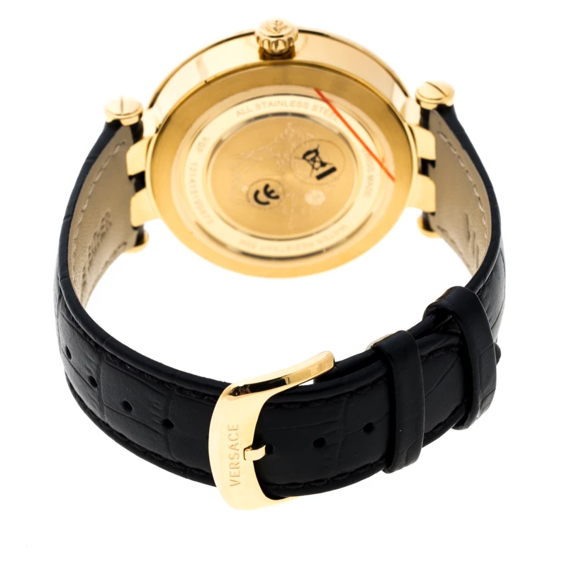 The interchangeable bezel accented with signature details is the highlight of this watch from Versace which is brimming with understated yet chic style. This simply elegant wristwatch has a round stainless steel case which is held by a black leather strap, secured by a buckle closure. The round dial is adorned with three hands and index hour markers with a small date window at three o’ clock position. Make this timepiece your everyday style companion.