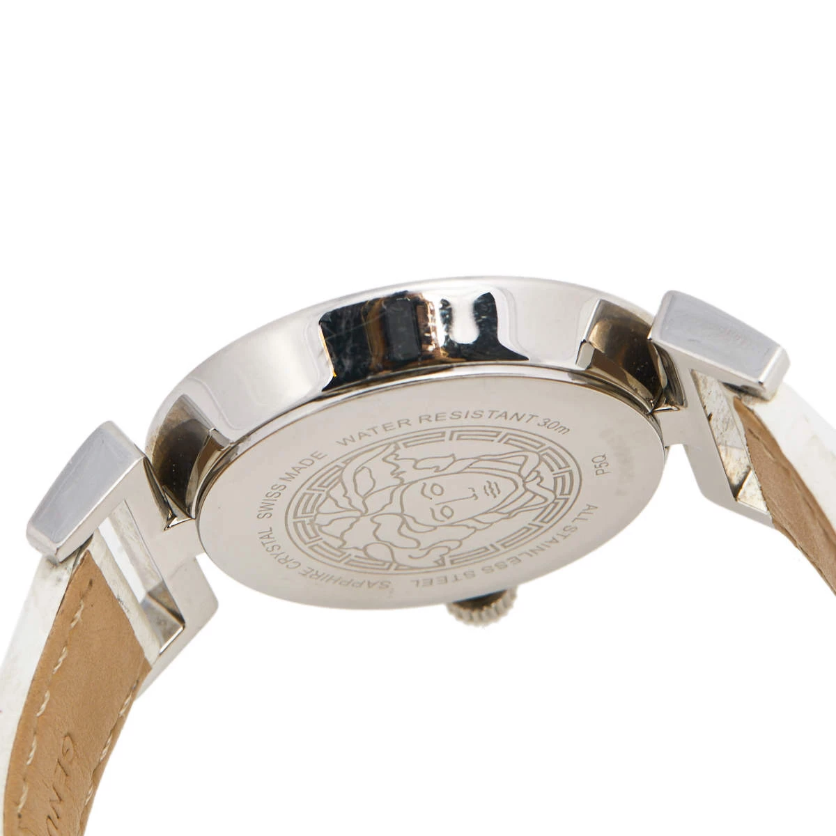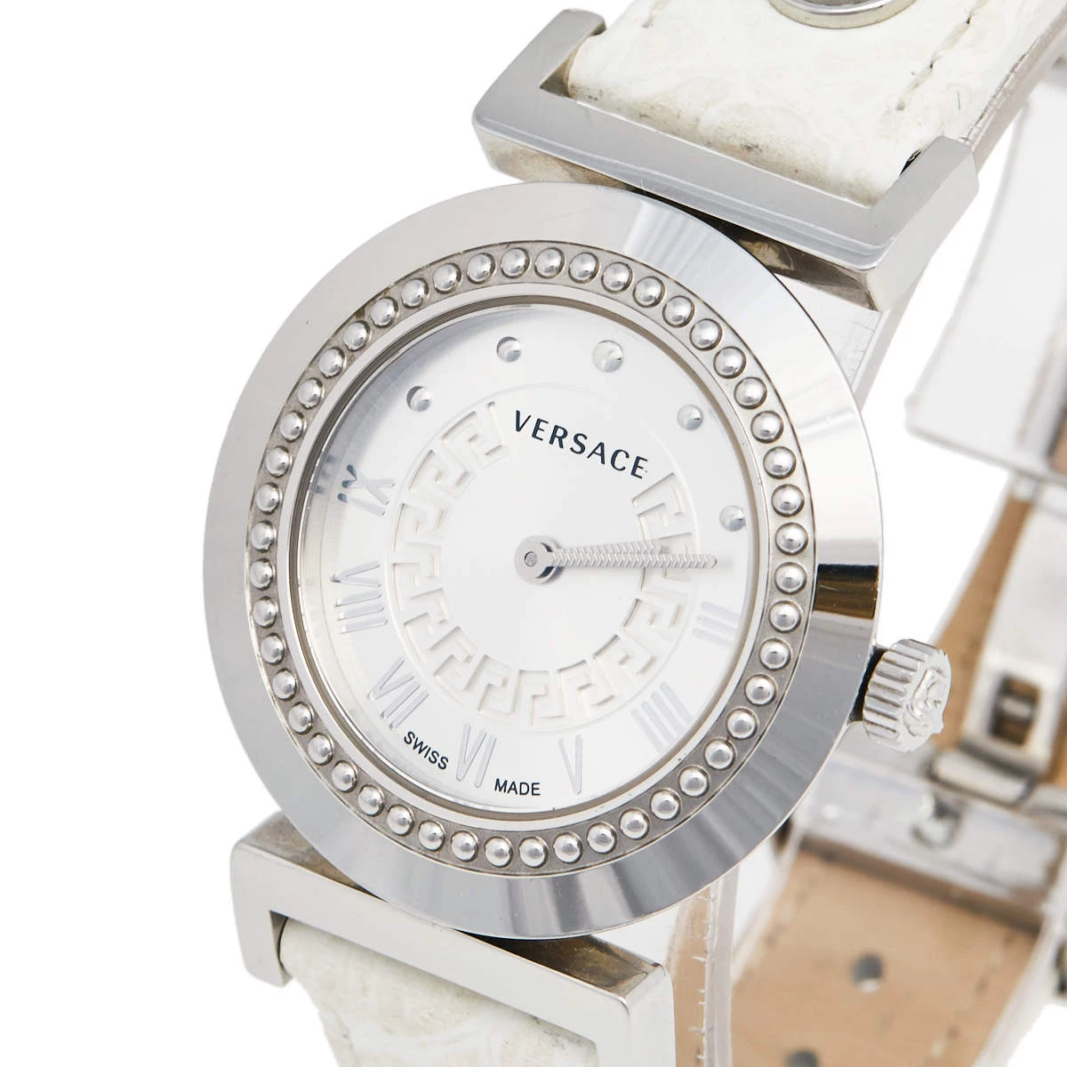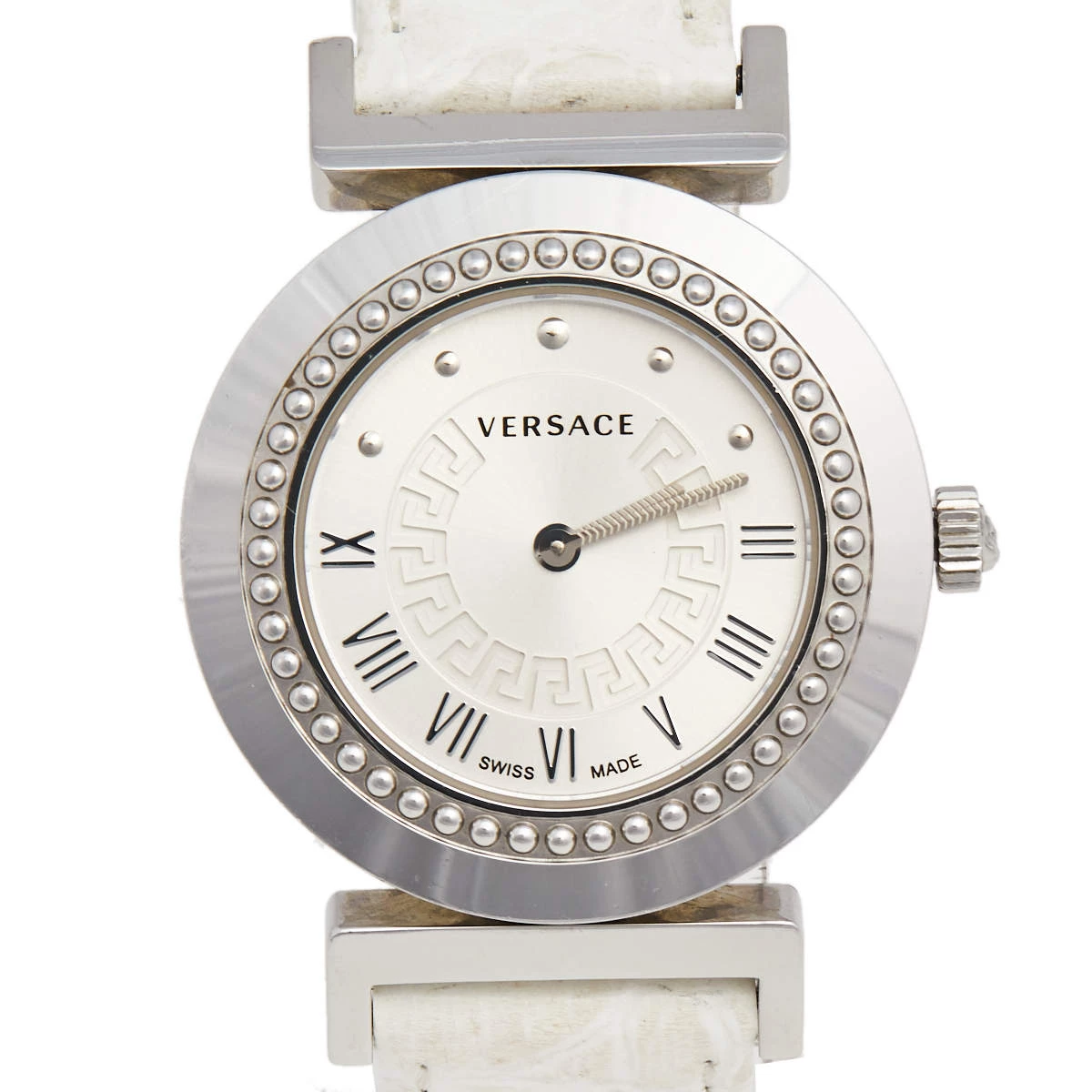 Versace offers designs portraying grand style with everything eye-catching and this Vanity P5Q from the label demonstrates just that. The watch is made of stainless steel and held by leather straps. It is graced with a stylish studded bezel and fitted within is a silver dial with silver-tone indicators and the signature Greek key symbols. This quartz watch has water resistance up to 30 meters and will look gorgeous on your wrist.