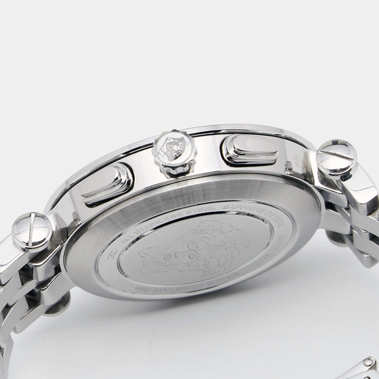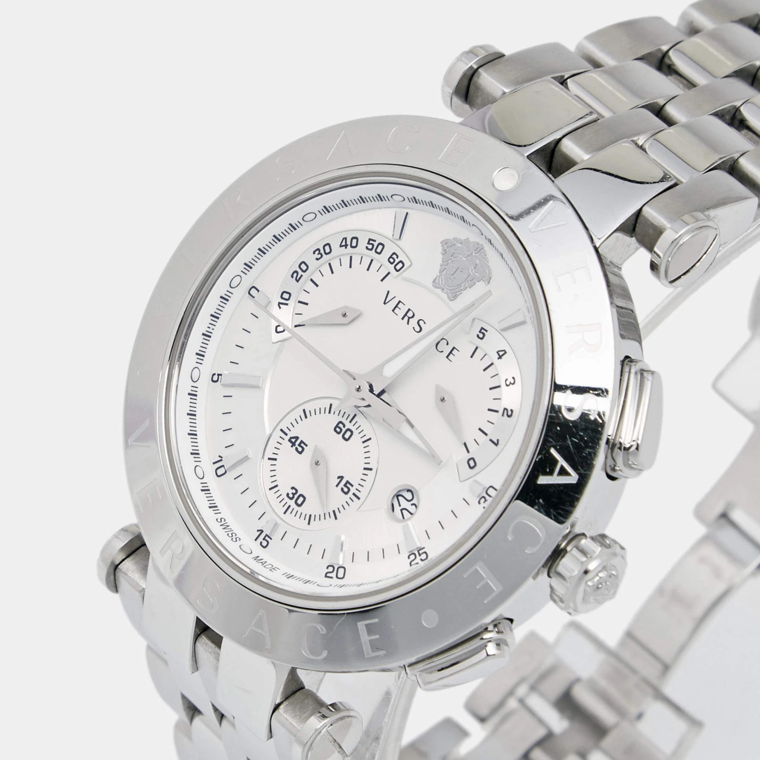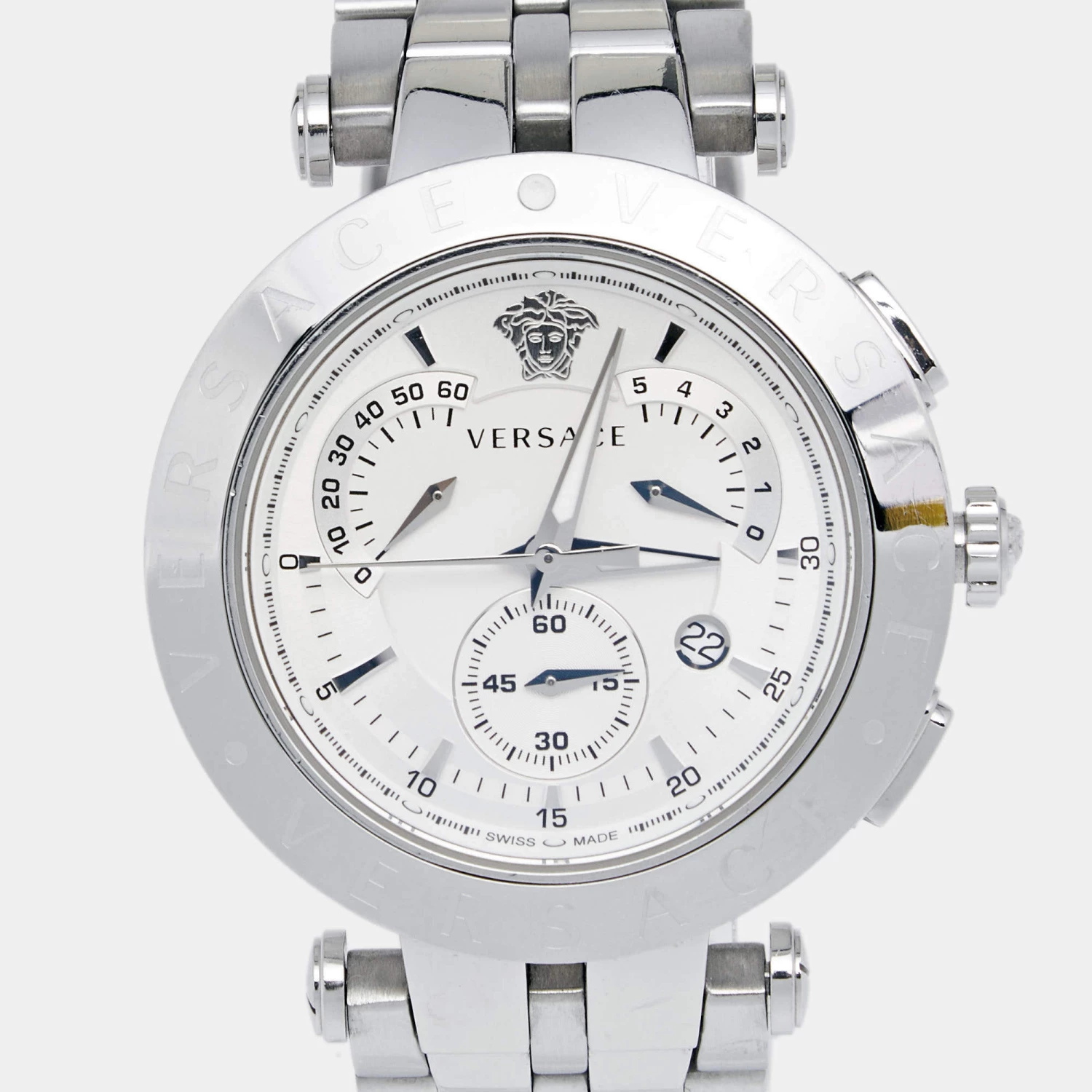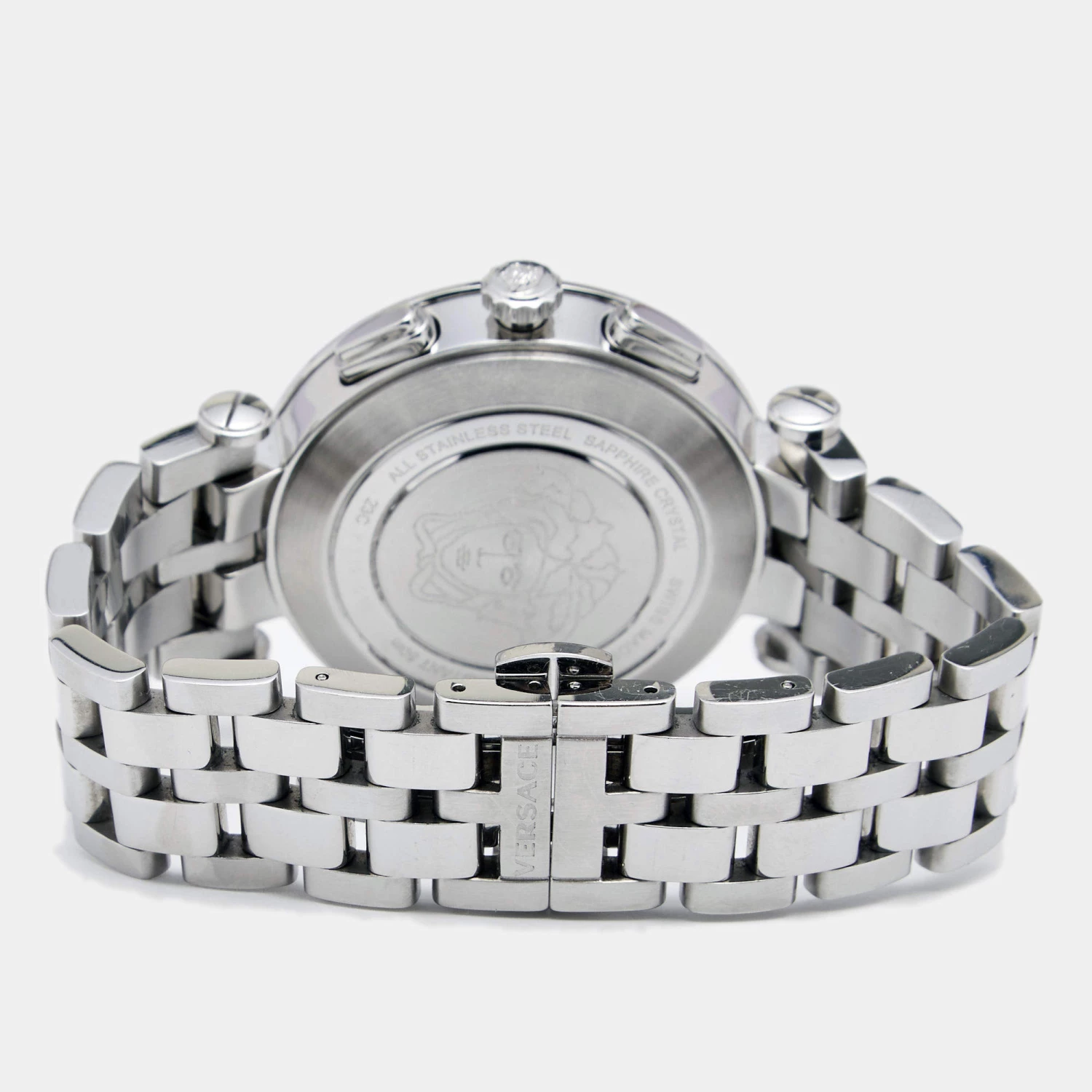 The elegant appeal is the highlight of this watch from Versace. This wristwatch has a round stainless steel case which is held by stainless steel chainlink bracelet, secured by a push-lock fastening. The round dial is adorned with subdials, and index hour markers with a small date window at the 4 o’clock position. Make this timepiece your everyday style companion.