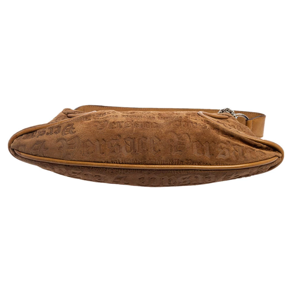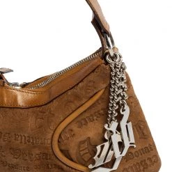 Versace brings us this well-shaped baguette bag that has been crafted from embossed suede and added with leather trimming and metal charms. The fabric-lined interior will easily hold your belongings and the handle can be held in your hand or on your shoulder.